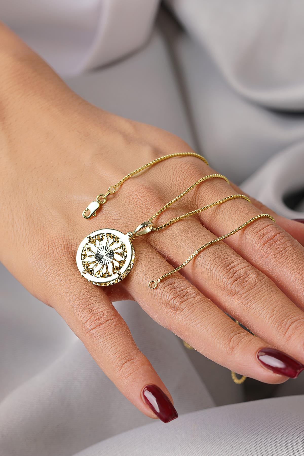 14 Ayar Altın Desenli Küp Zincirli Güneş Uçlu Kolye