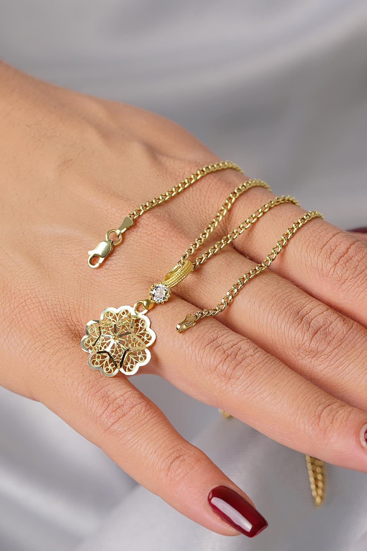 14 Ayar Altın Gurmet Zincirde Gül Motifli Telkari Kolye