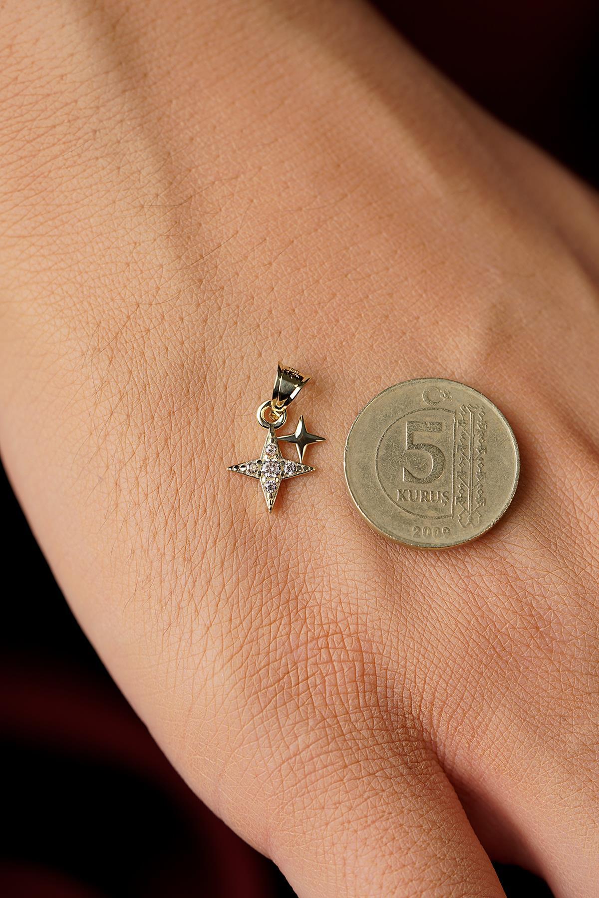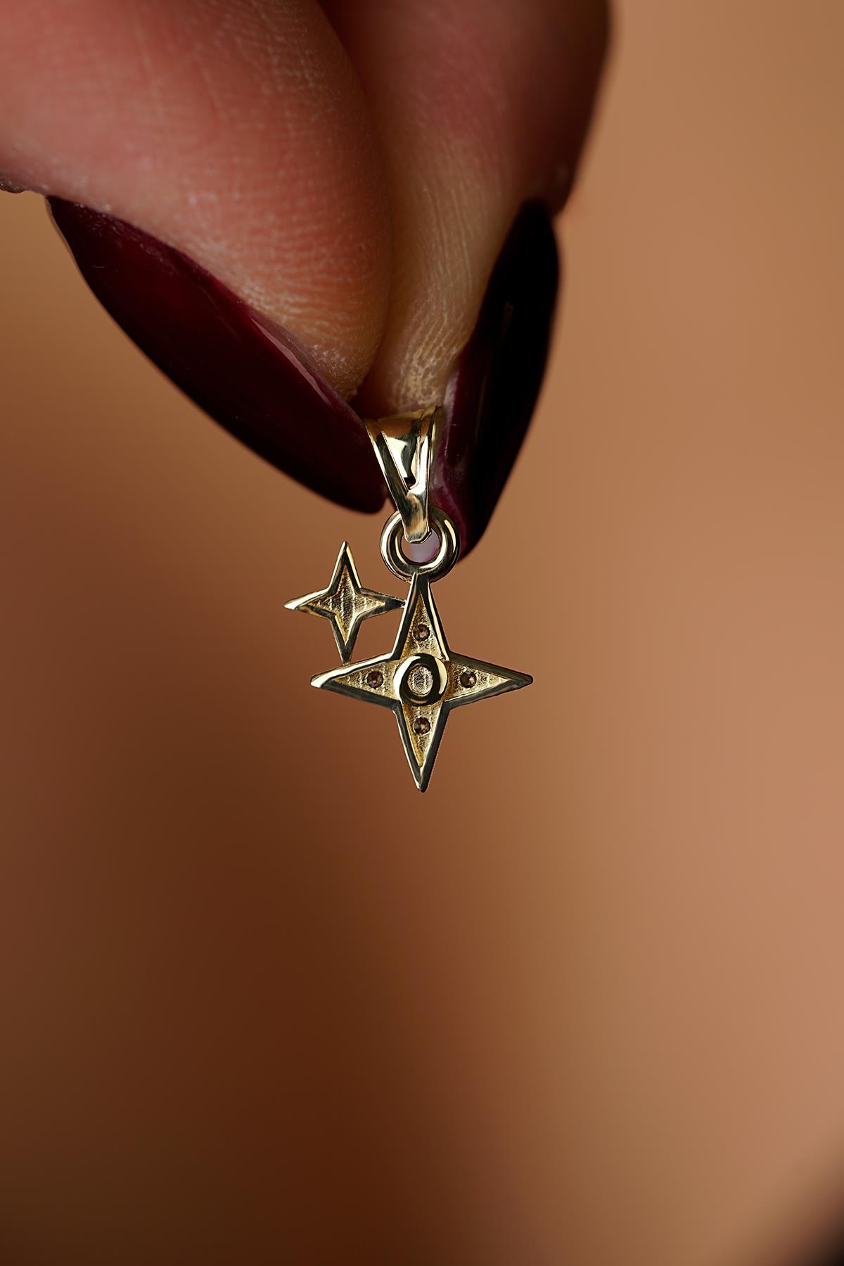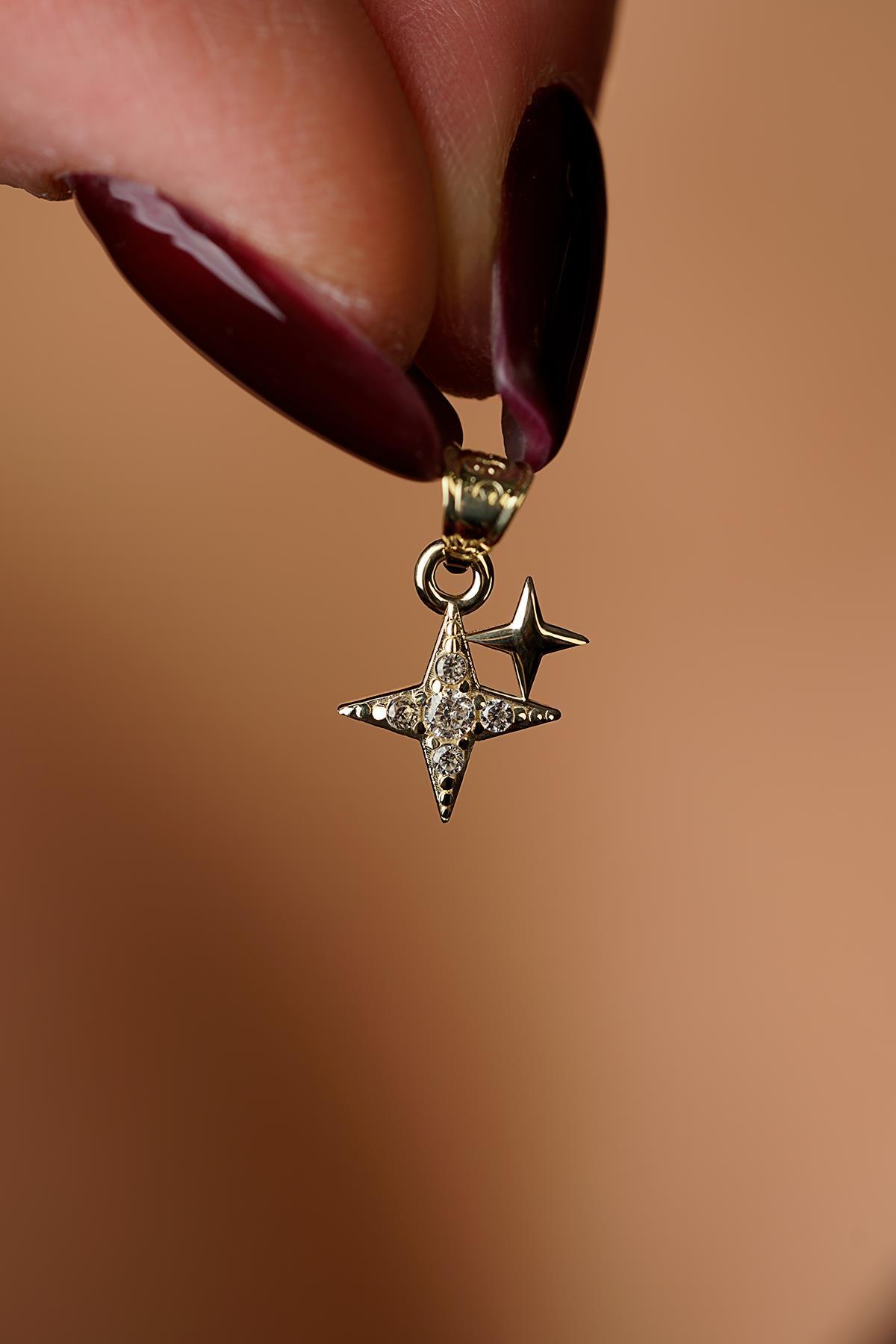 14 Ayar Altın Işıltılı Minik İkili Taşlı Tasarım Yıldız Kolye Ucu