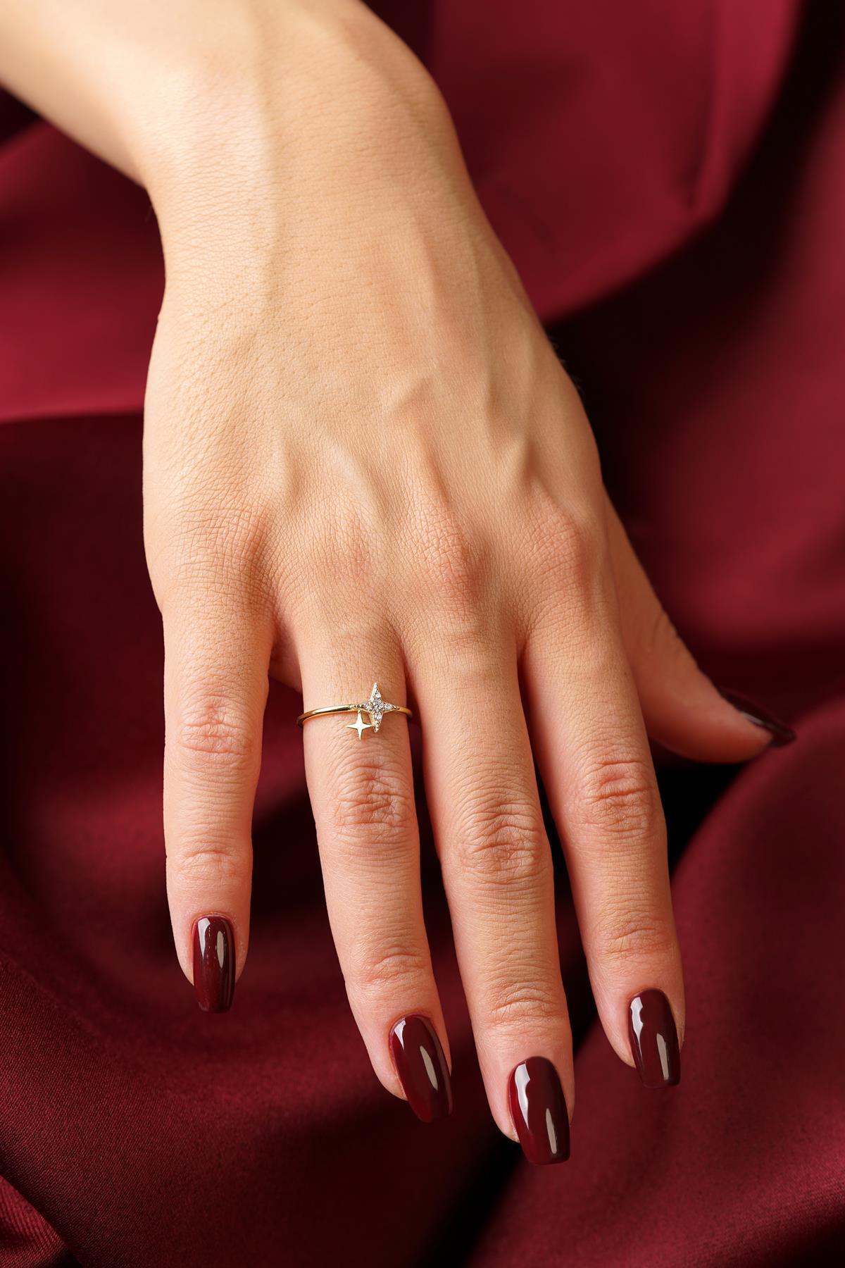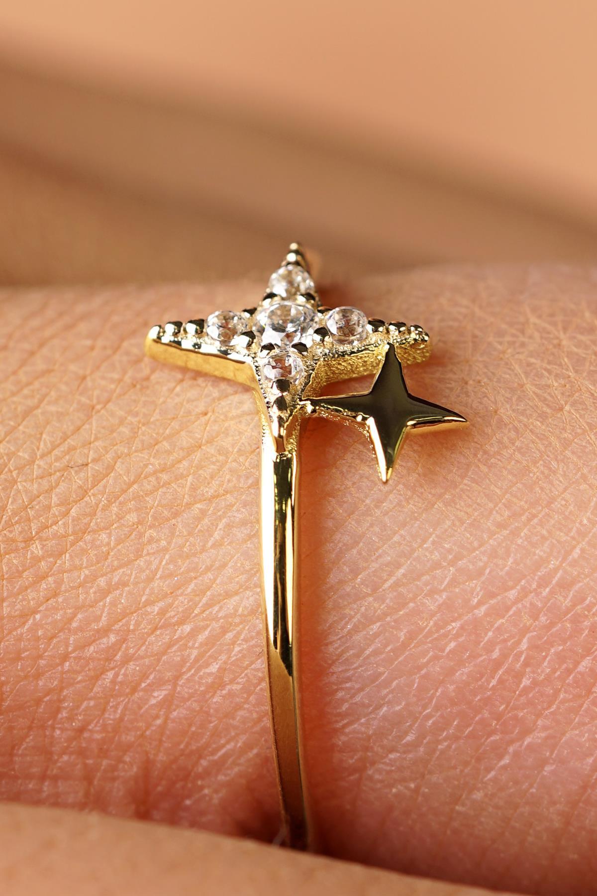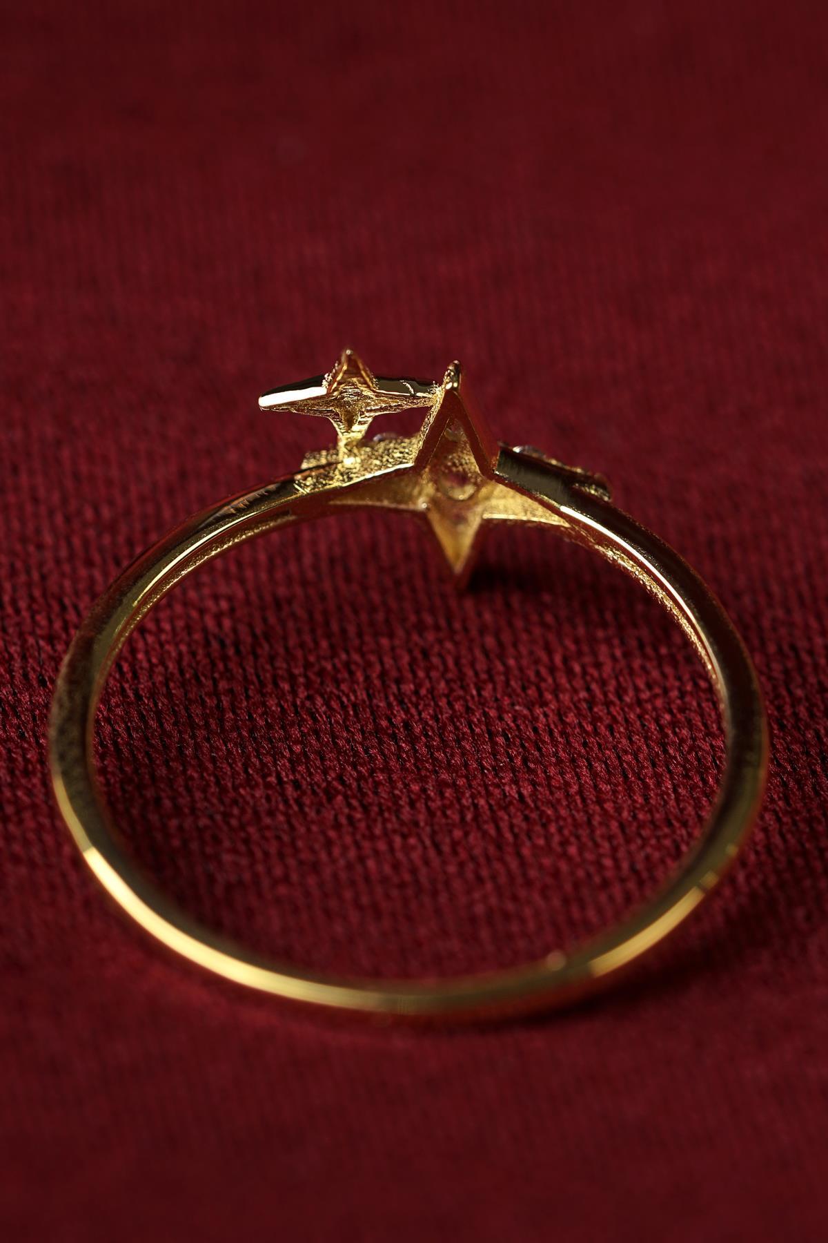 14 Ayar Altın Işıltılı Minik İkili Taşlı Yıldız Yüzük