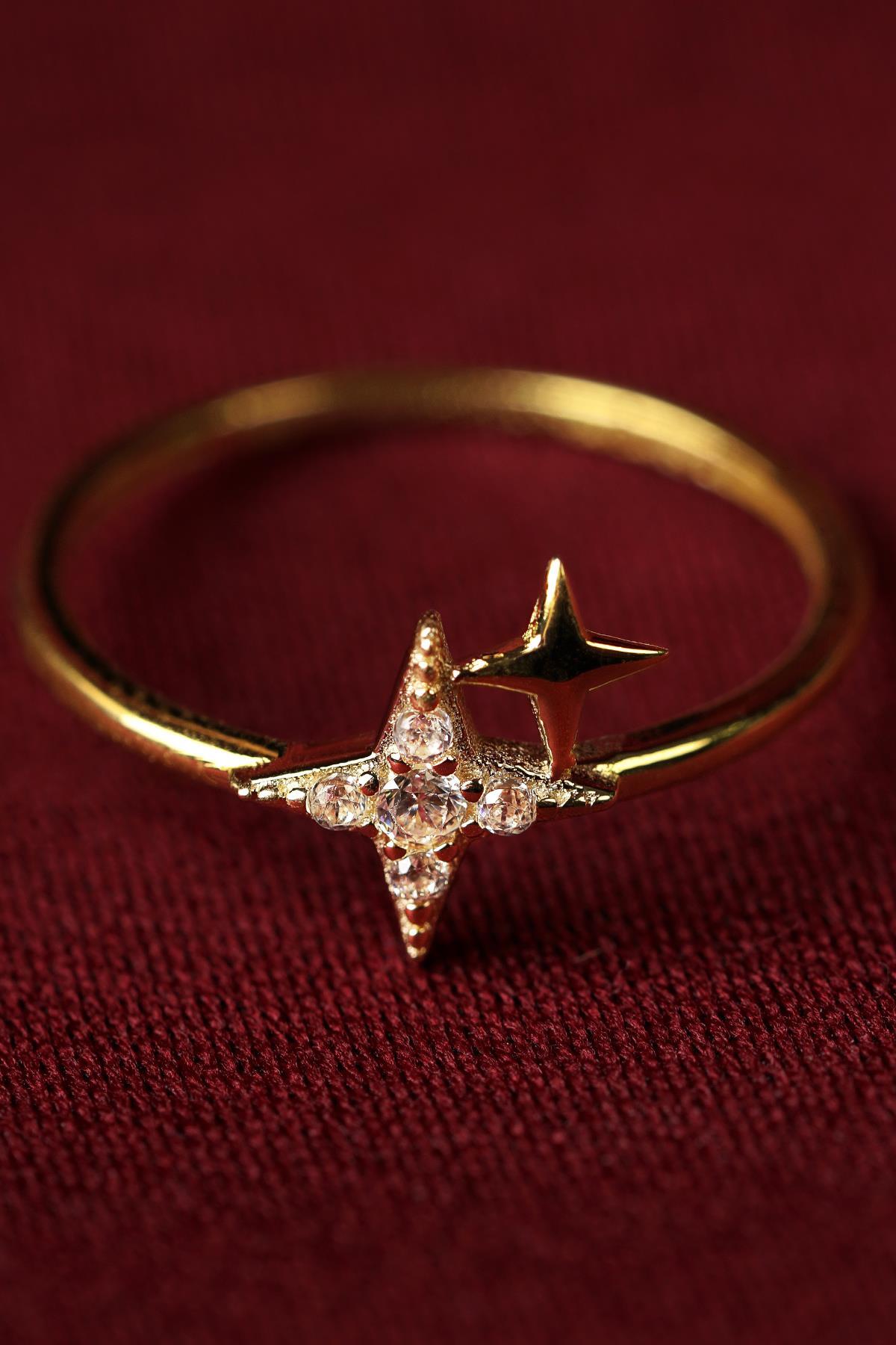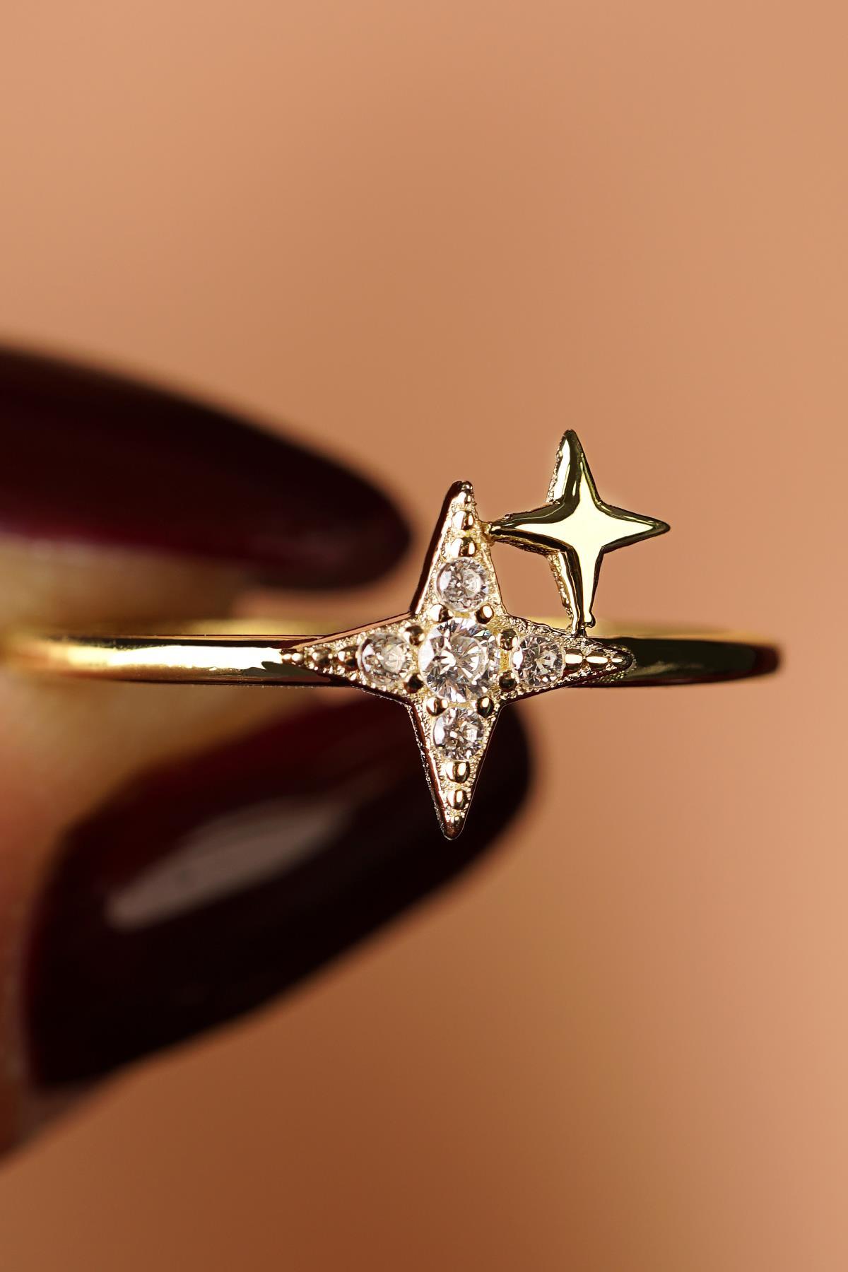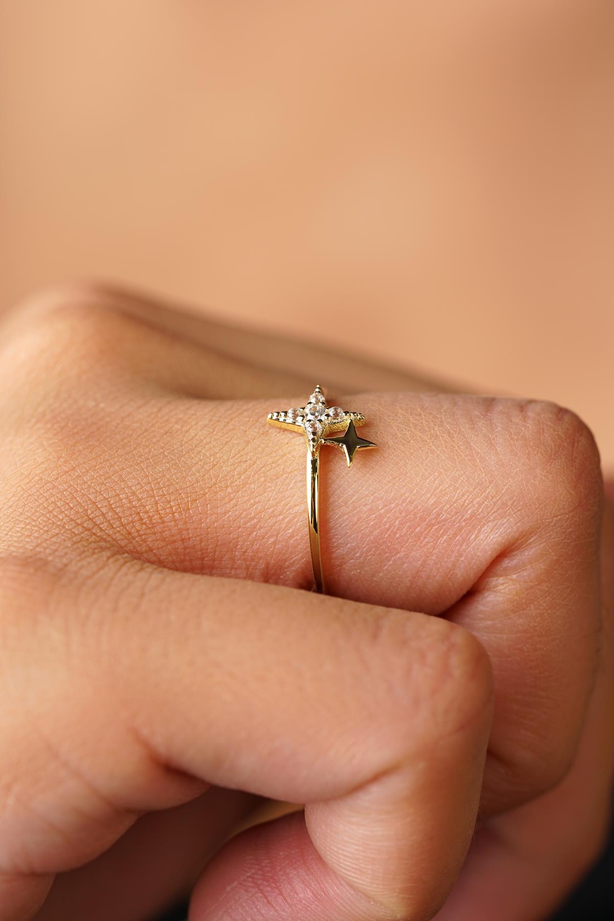 14 Ayar Altın Işıltılı Minik İkili Taşlı Yıldız Yüzük