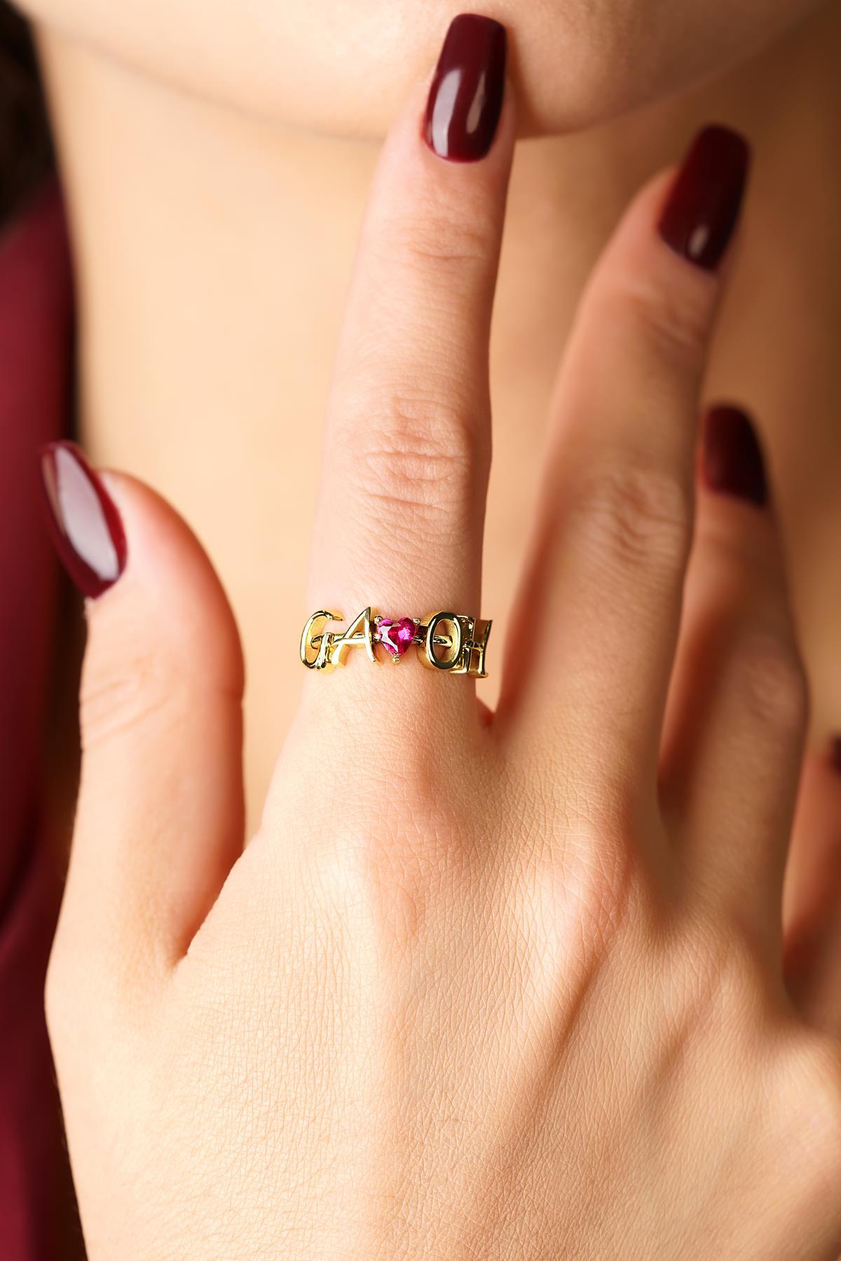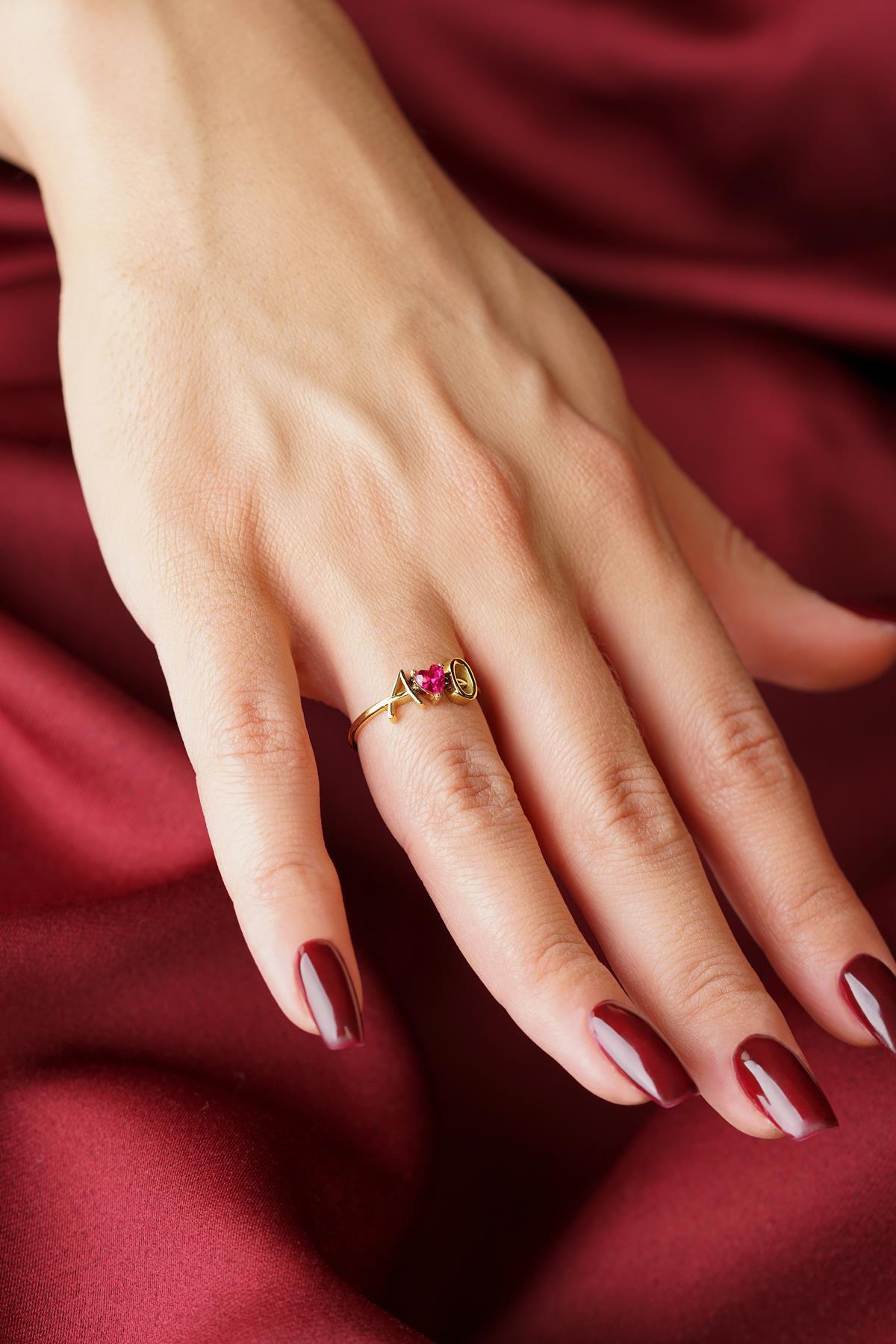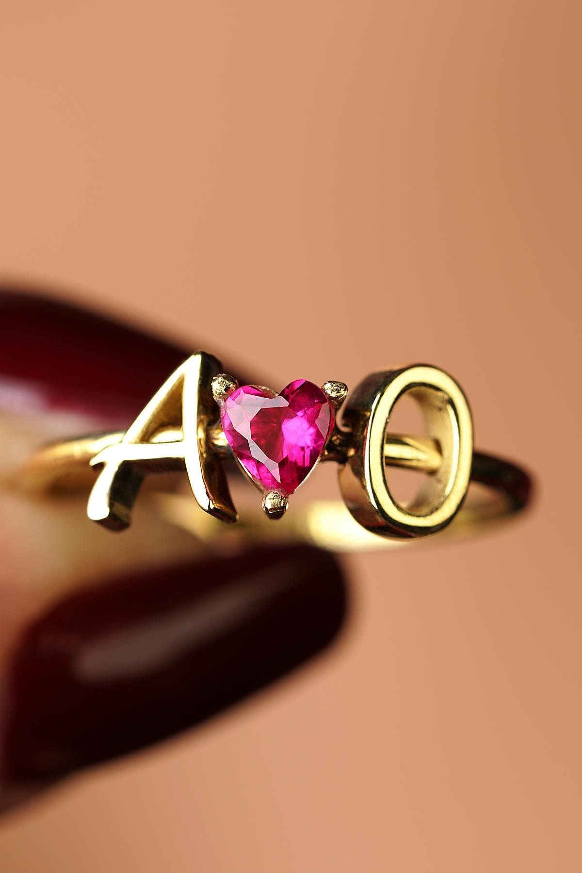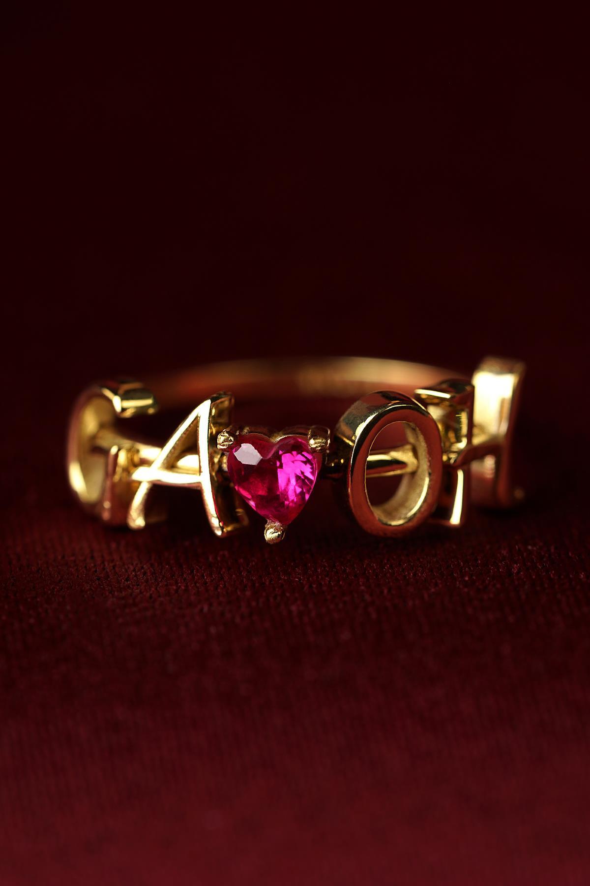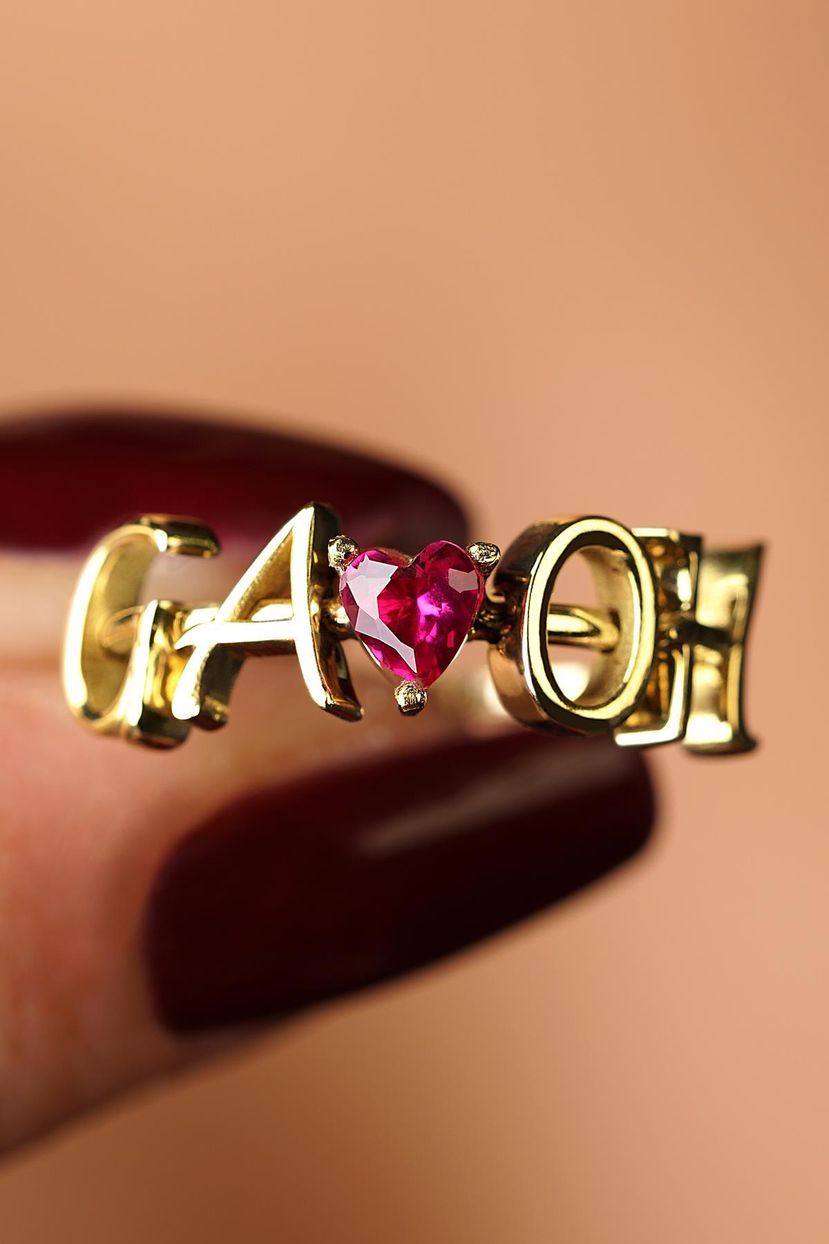 14 Ayar Altın Kırmızı Kalpli Kişiye Özel Tasarım Harfli Yüzük