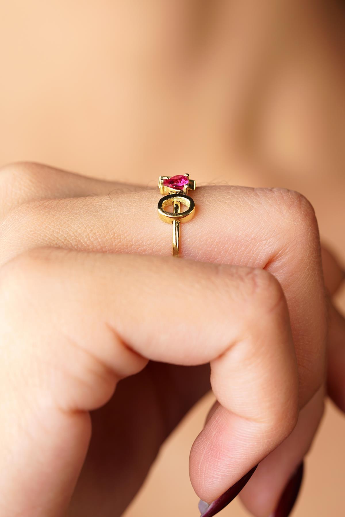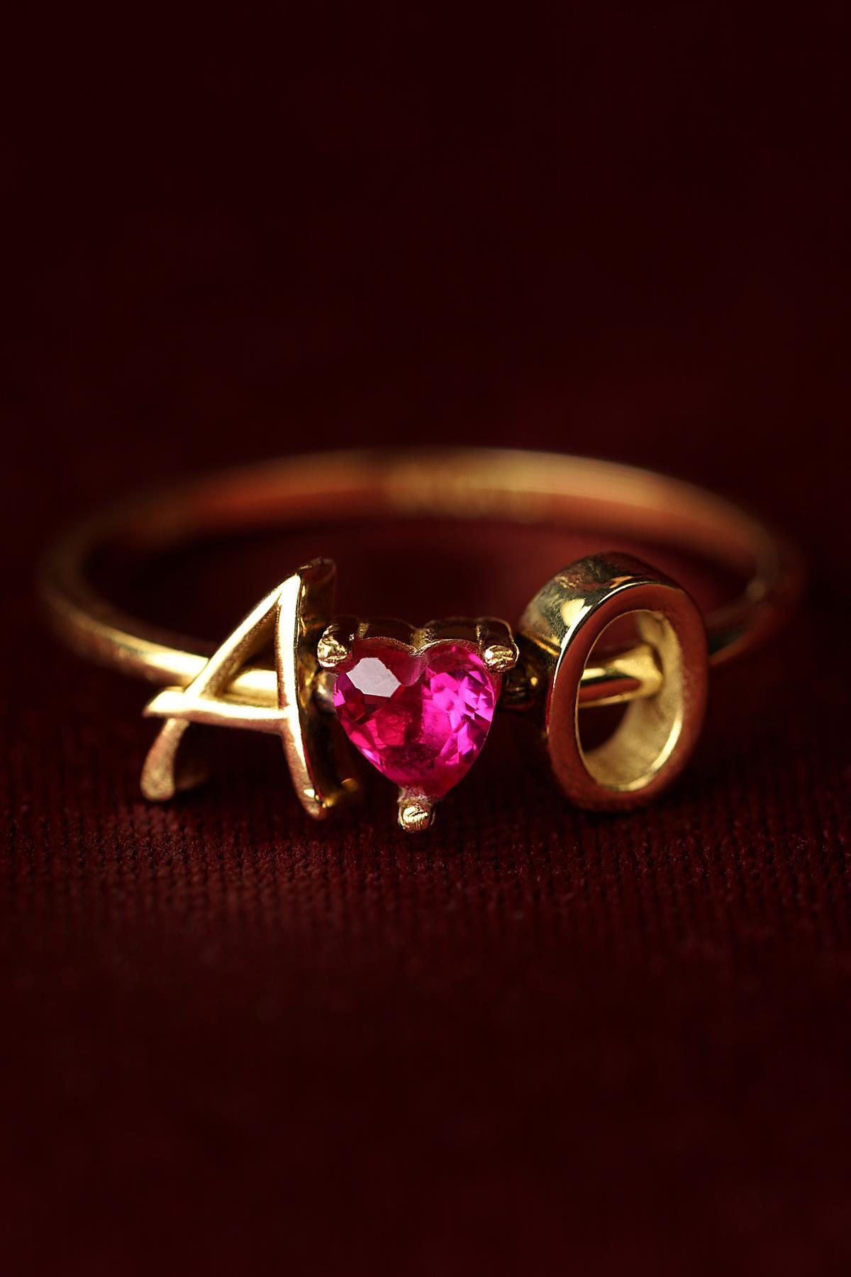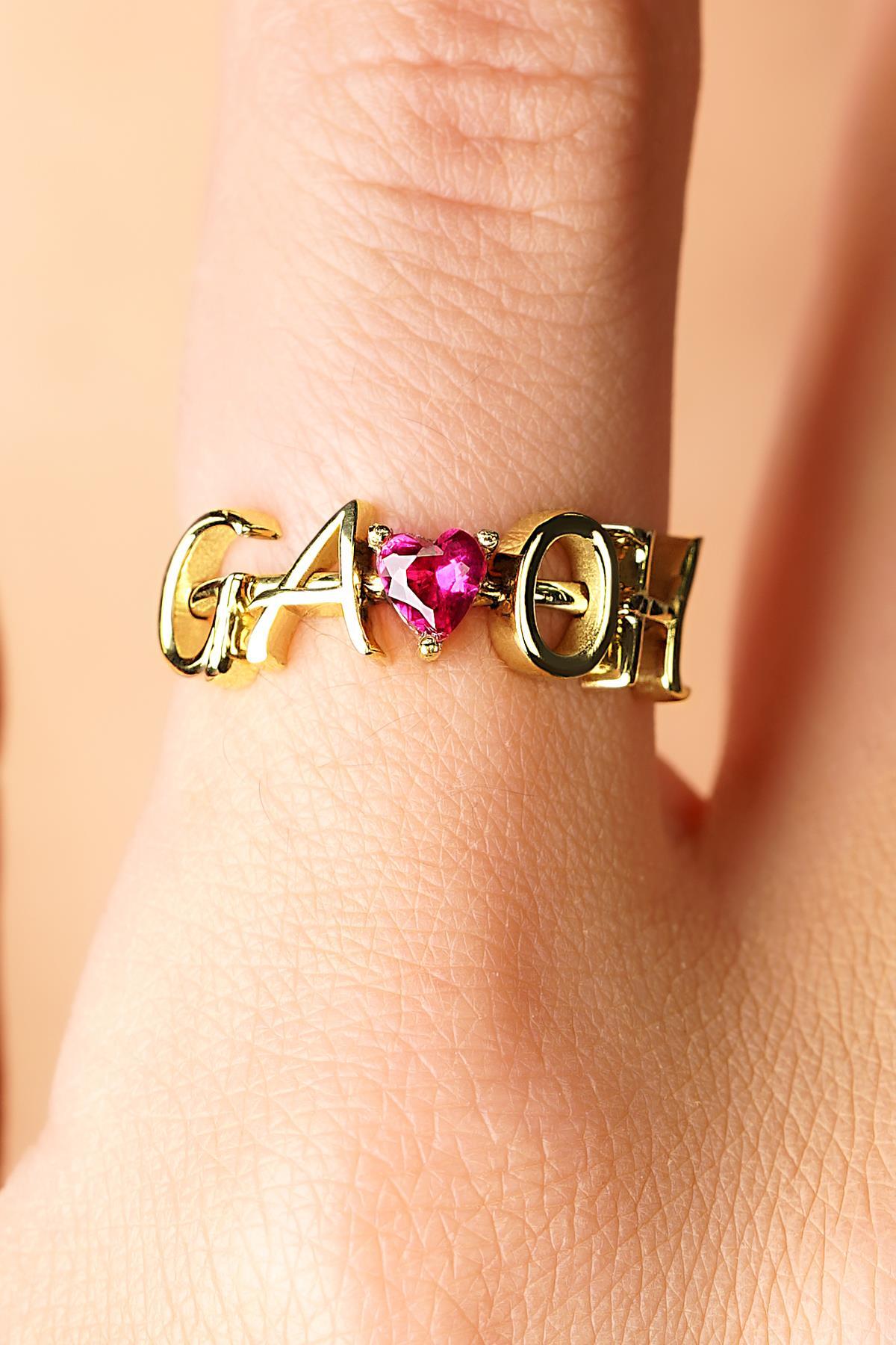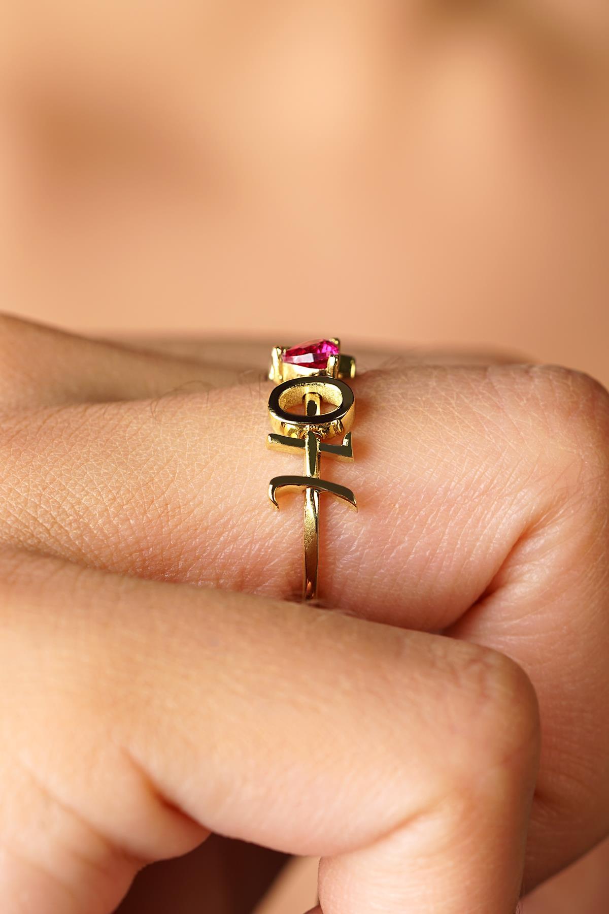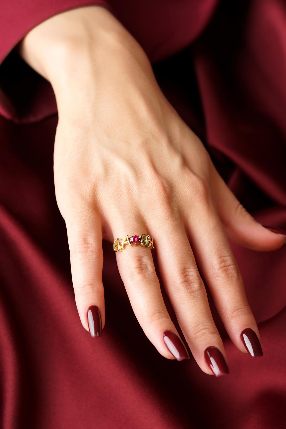14 Ayar Altın Kırmızı Kalpli Kişiye Özel Tasarım Harfli Yüzük