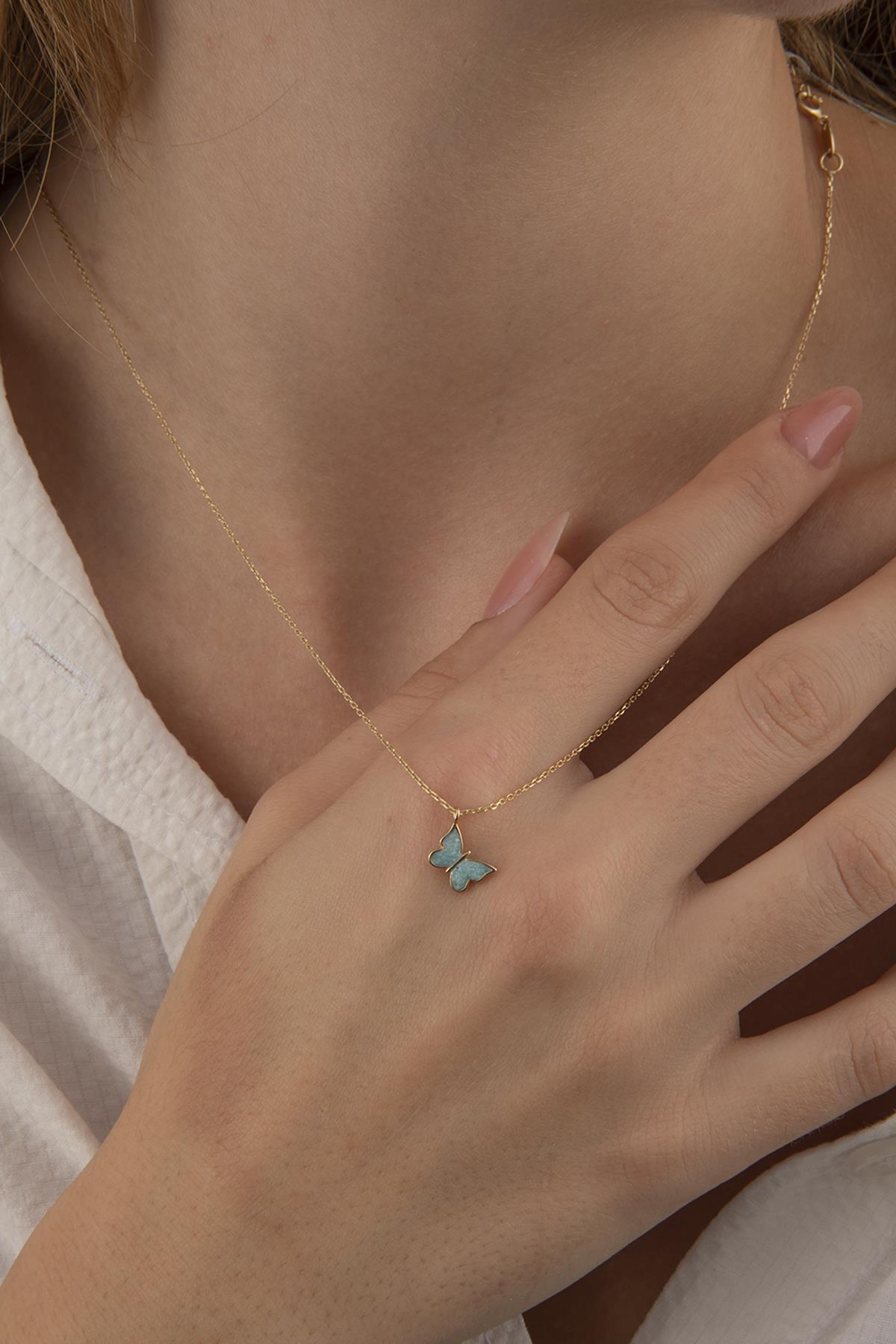 14 Ayar Altın Mavi Mineli Kelebek Kolye