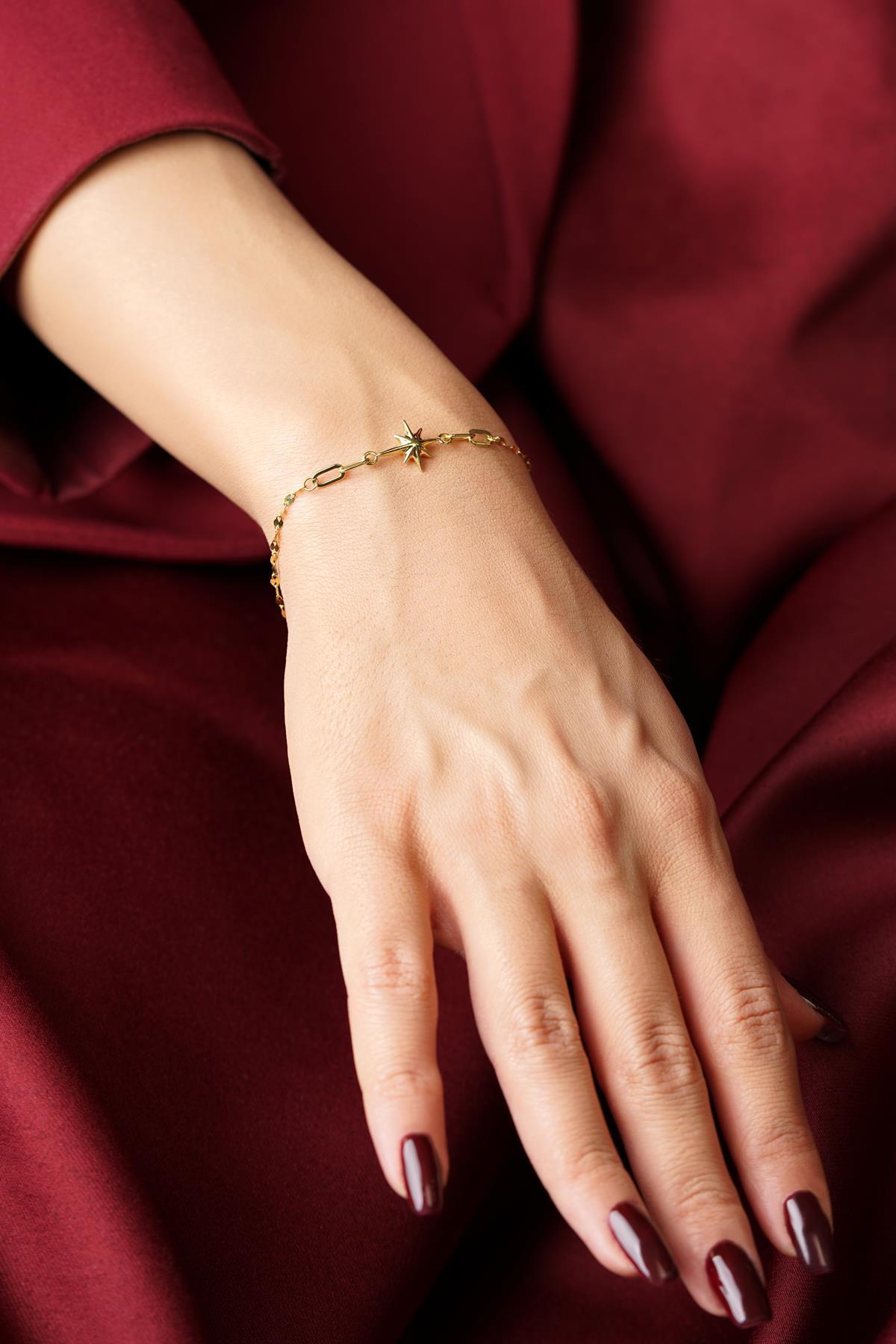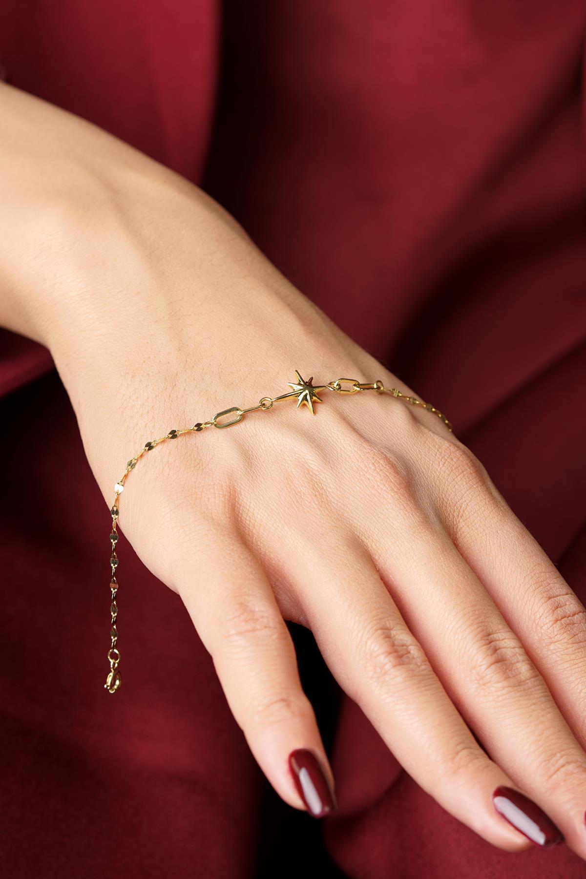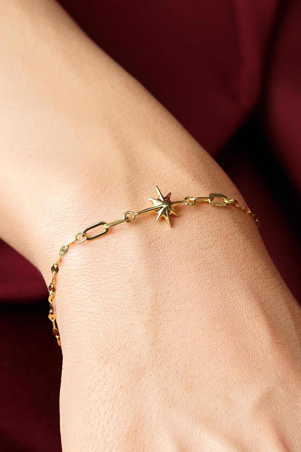14 Ayar Altın Şişko Kuzey Yıldız Aynalı Zincirl Bileklik