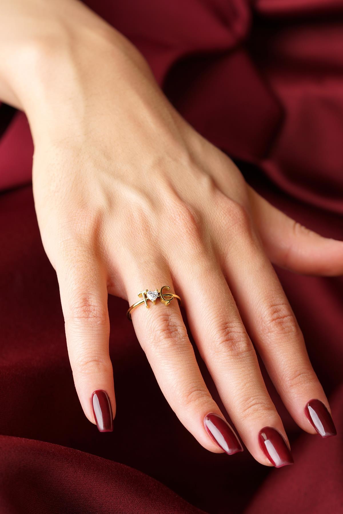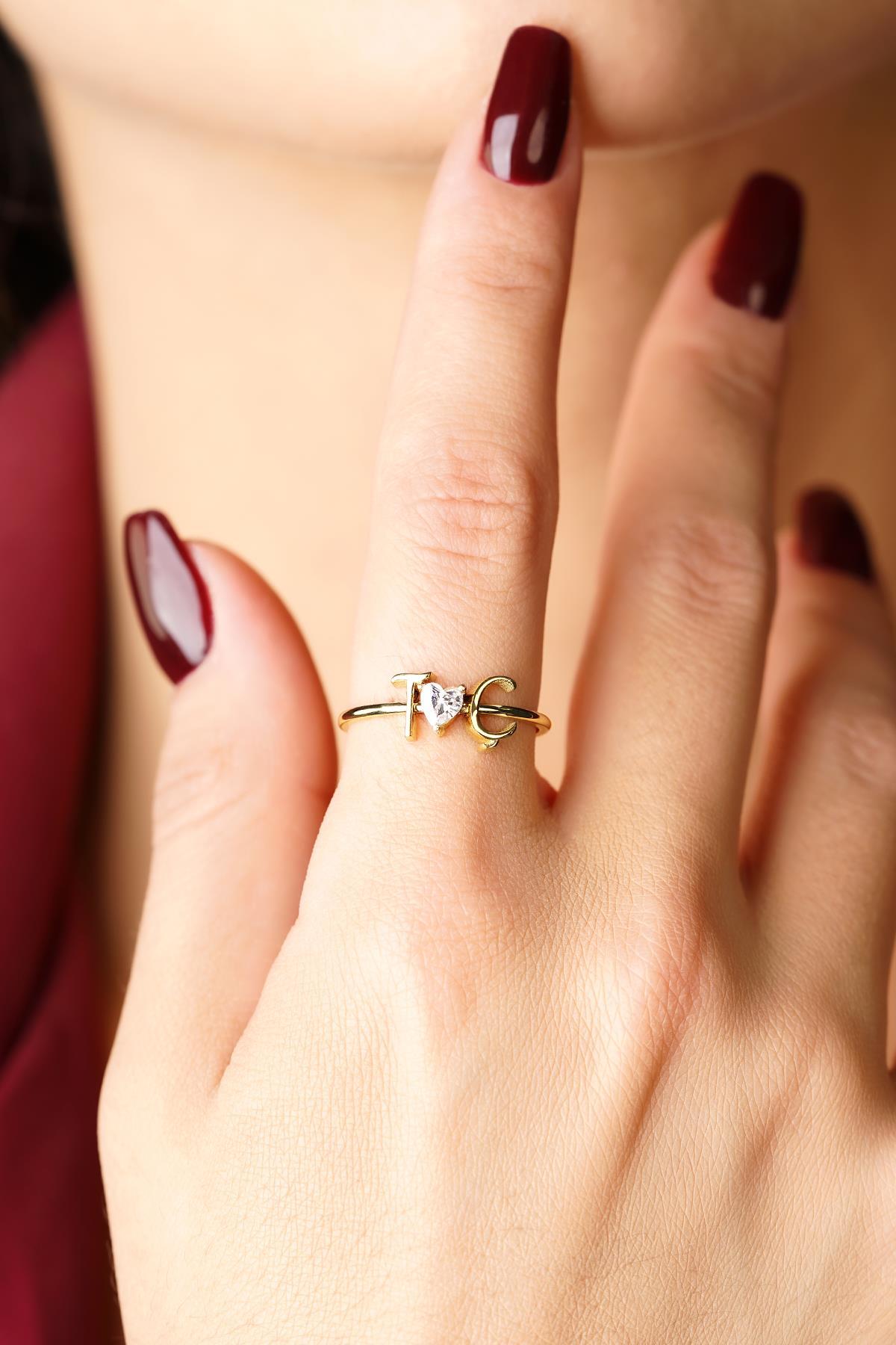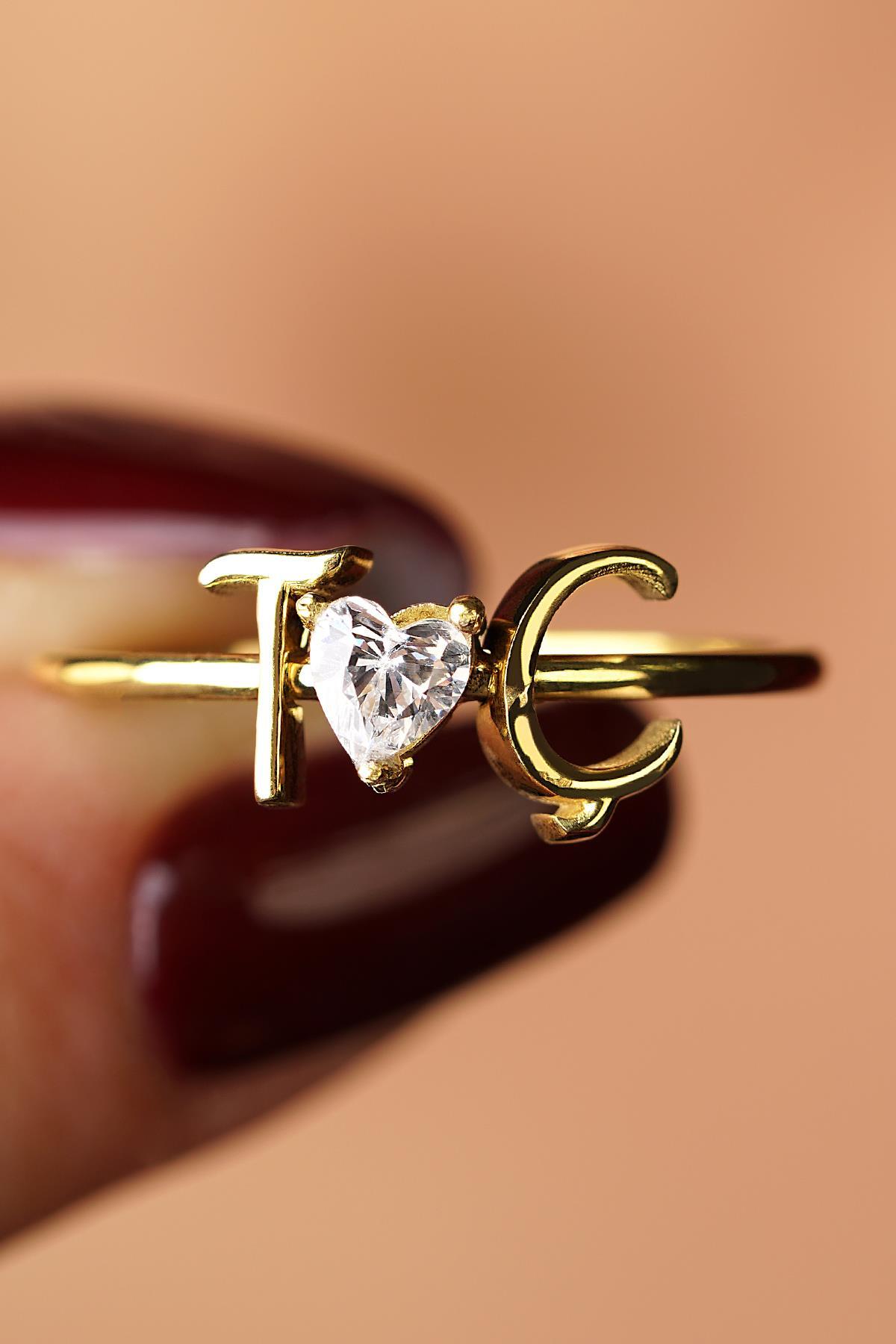 14 Ayar Altın Taşlı Kalpli Kişiye Özel Tasarım Harfli Yüzük