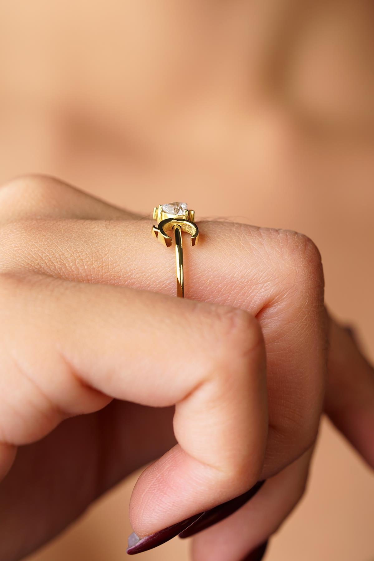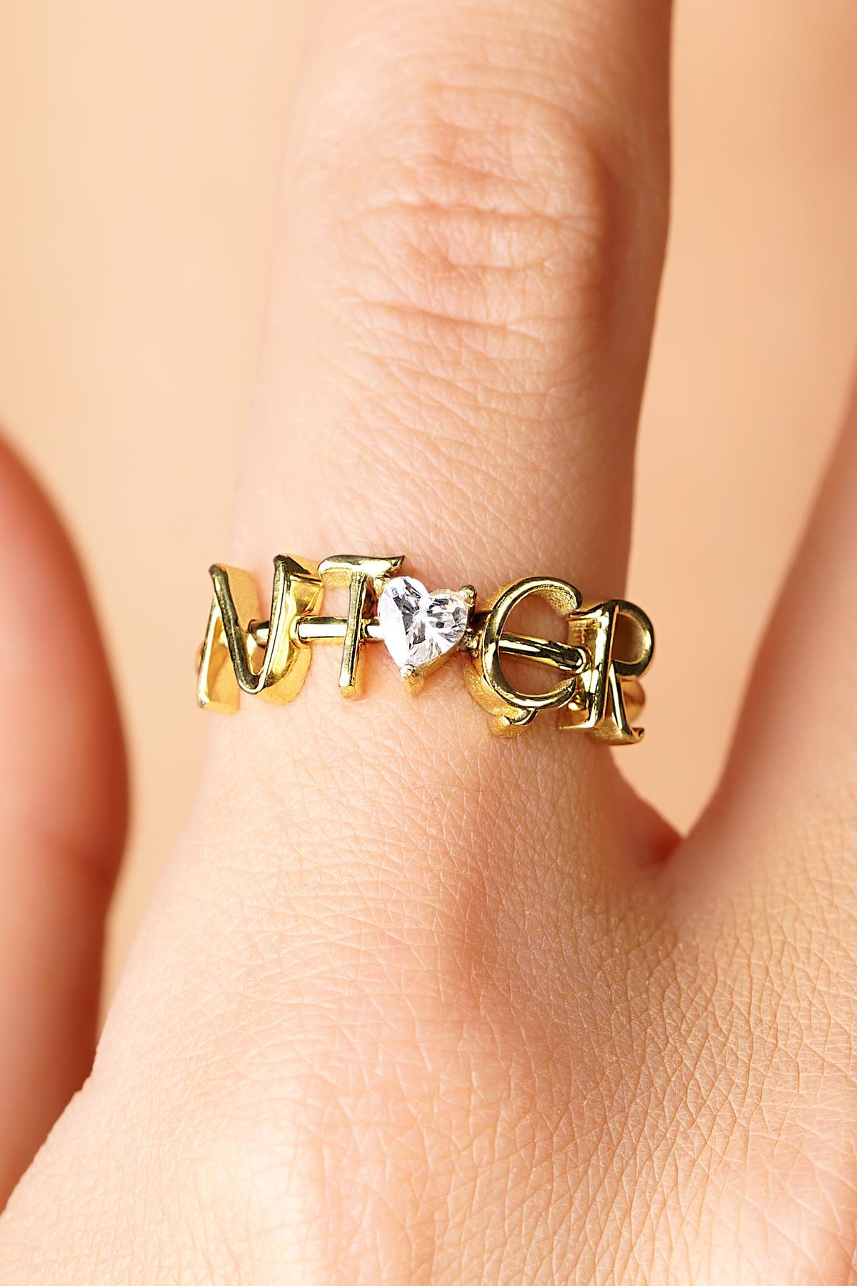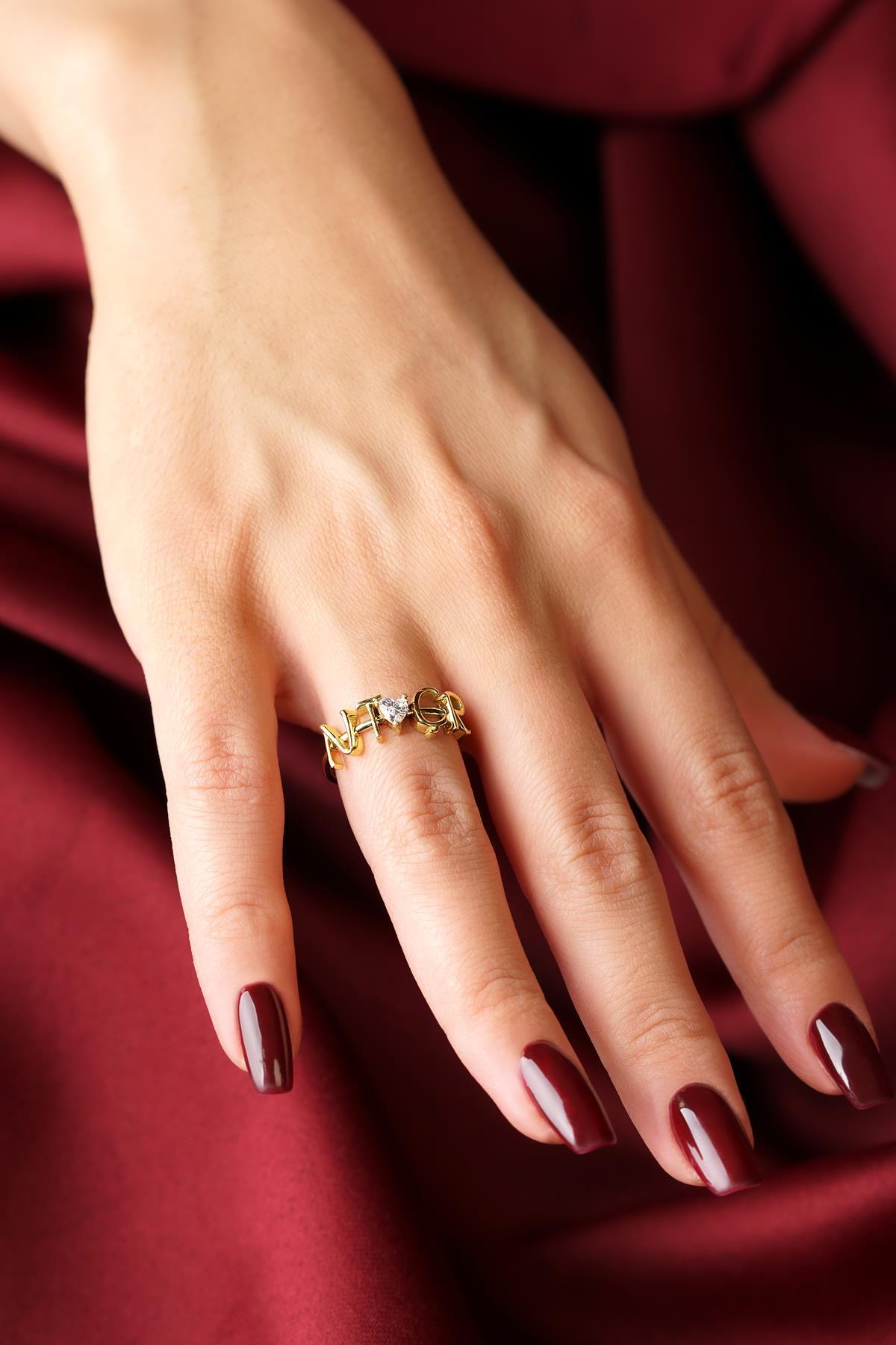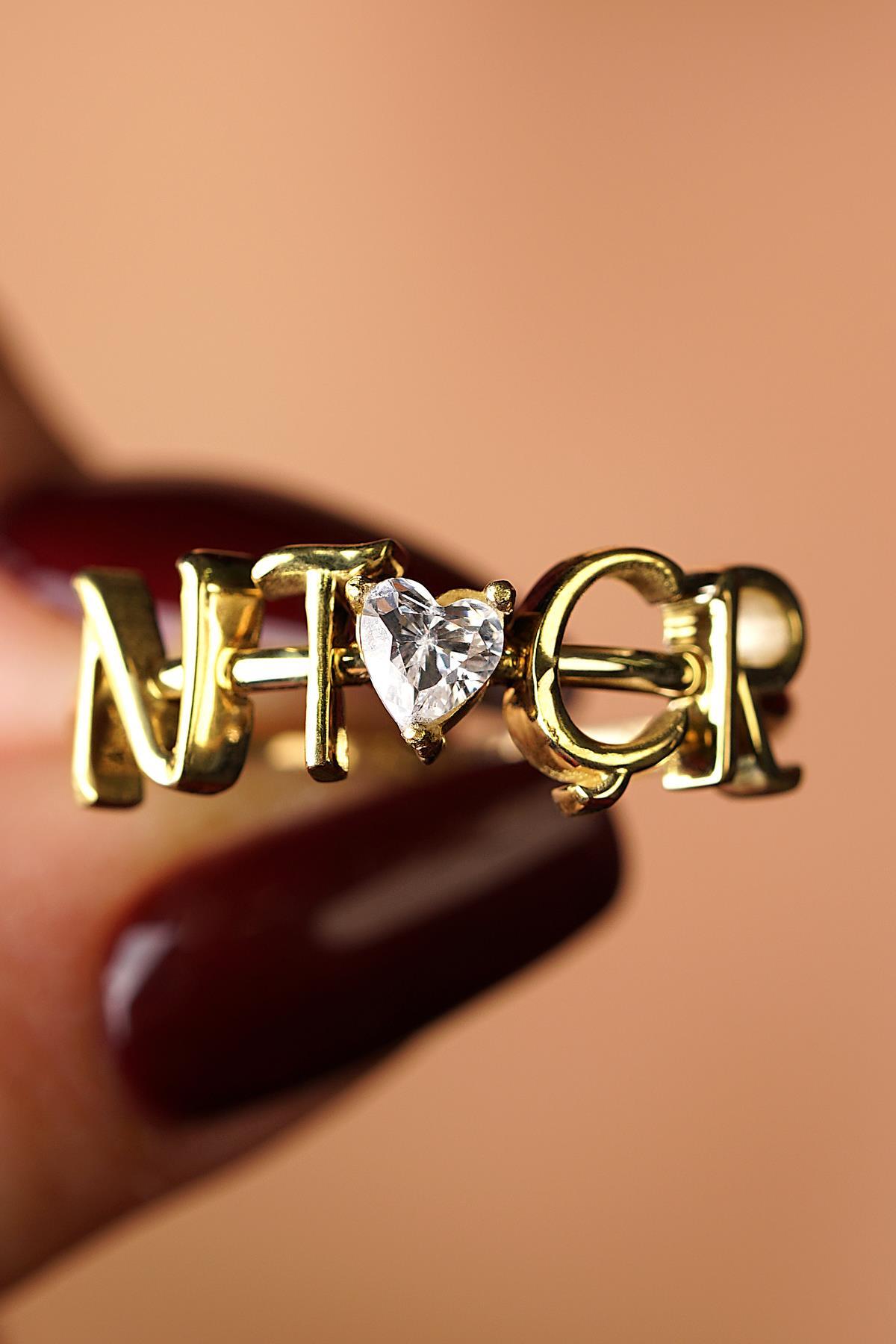 14 Ayar Altın Taşlı Kalpli Kişiye Özel Tasarım Harfli Yüzük