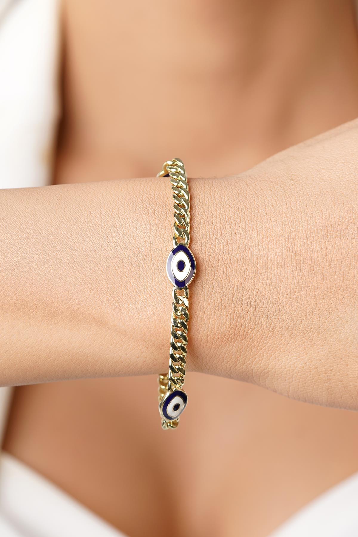 14 Ayar Altın 3'lü Lacivert Çekik Göz Gurmet Zincir Bileklik