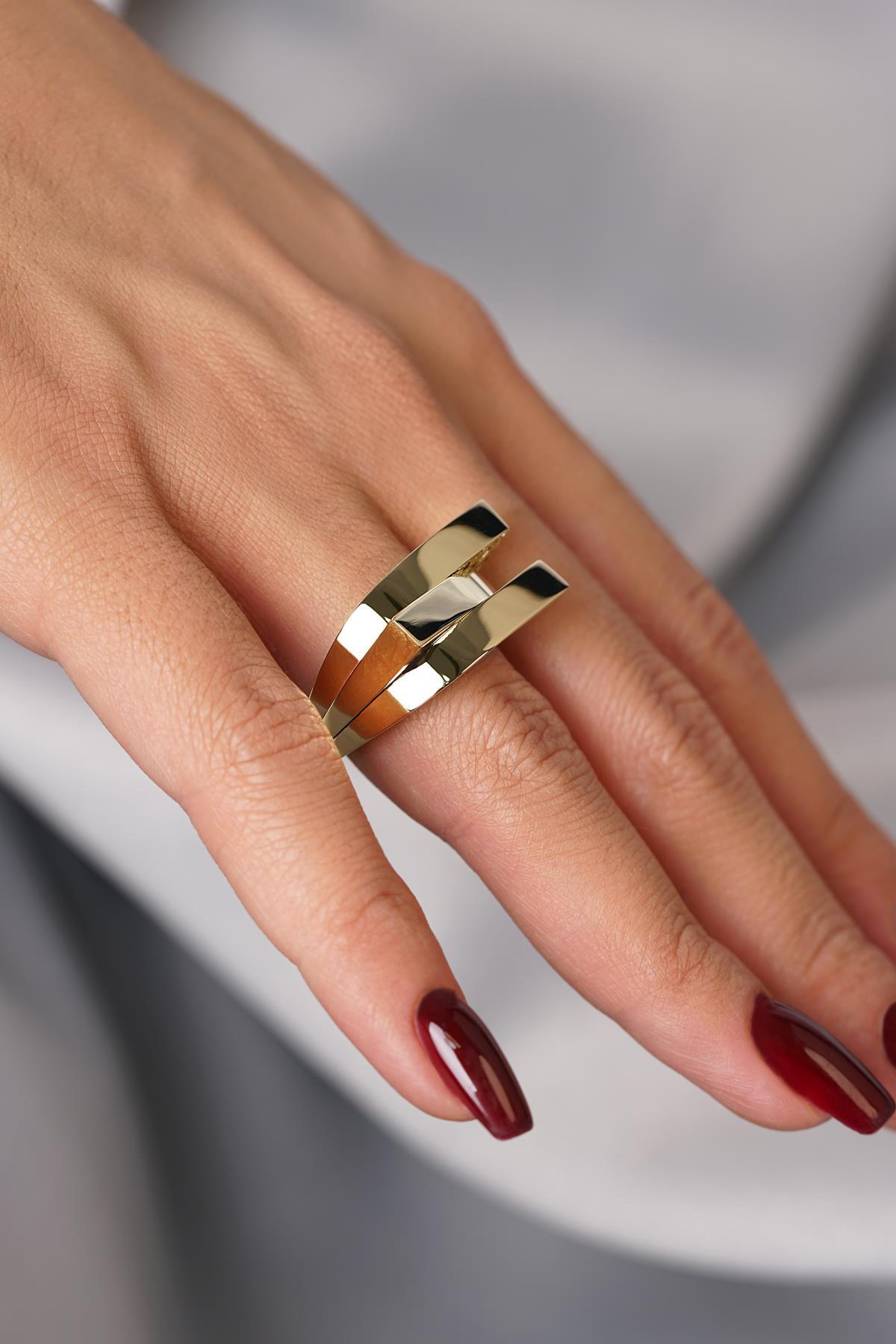 14 Ayar Altın Çift Kare Objeli Yüzük