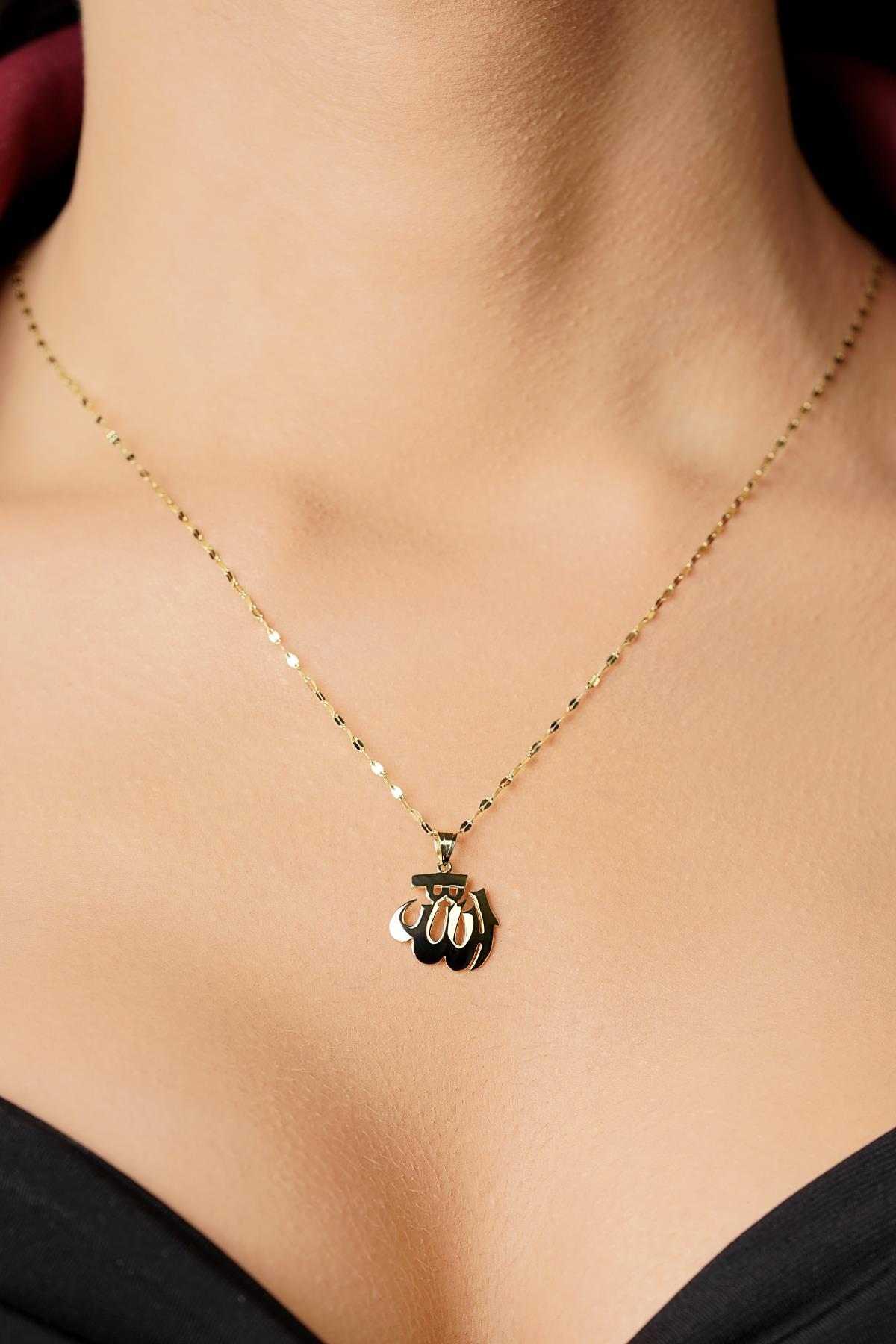 14 Ayar Altın Aynalı Zincir Allah Yazılı Kolye Büyük