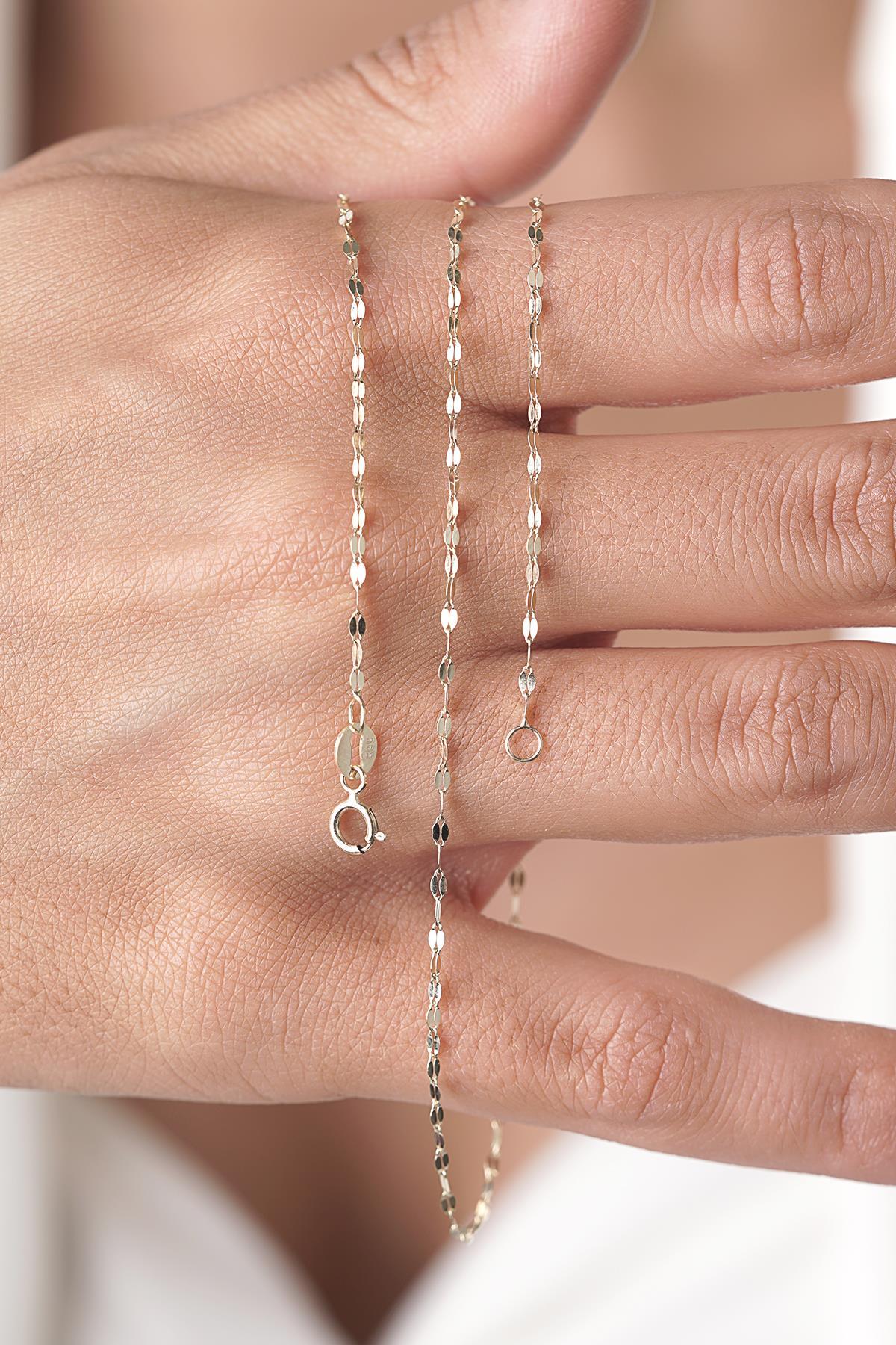Paylaştığınız görselde zincirin, klasik düz zincir formundan farklı olarak aynalanmış (parlatılmış) küçük bakla yüzeylerine sahip olduğu net biçimde görülüyor. Bu yapı, taş kullanılmadan da “canlı” bir görünüm üretir: Işık, baklalar üzerinde küçük yansımalar yapar; zincir boyunda ince bir hat gibi durur ve abartıya kaçmadan dikkat çeker. Ayrıca zincirin kolye ucu olmadan tek başına kullanılabilecek kadar karakterli bir doku sunduğu da görselden anlaşılır.
