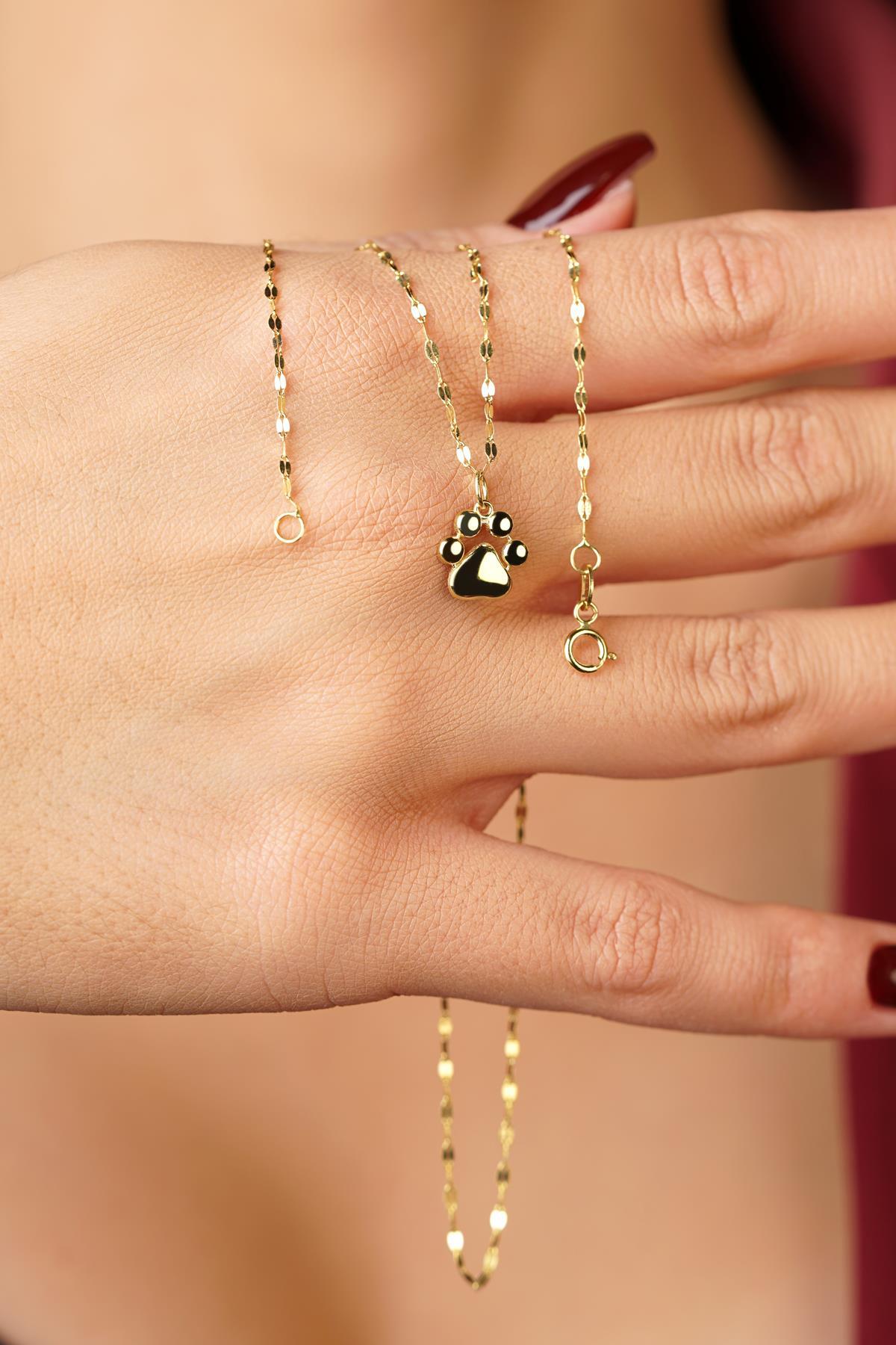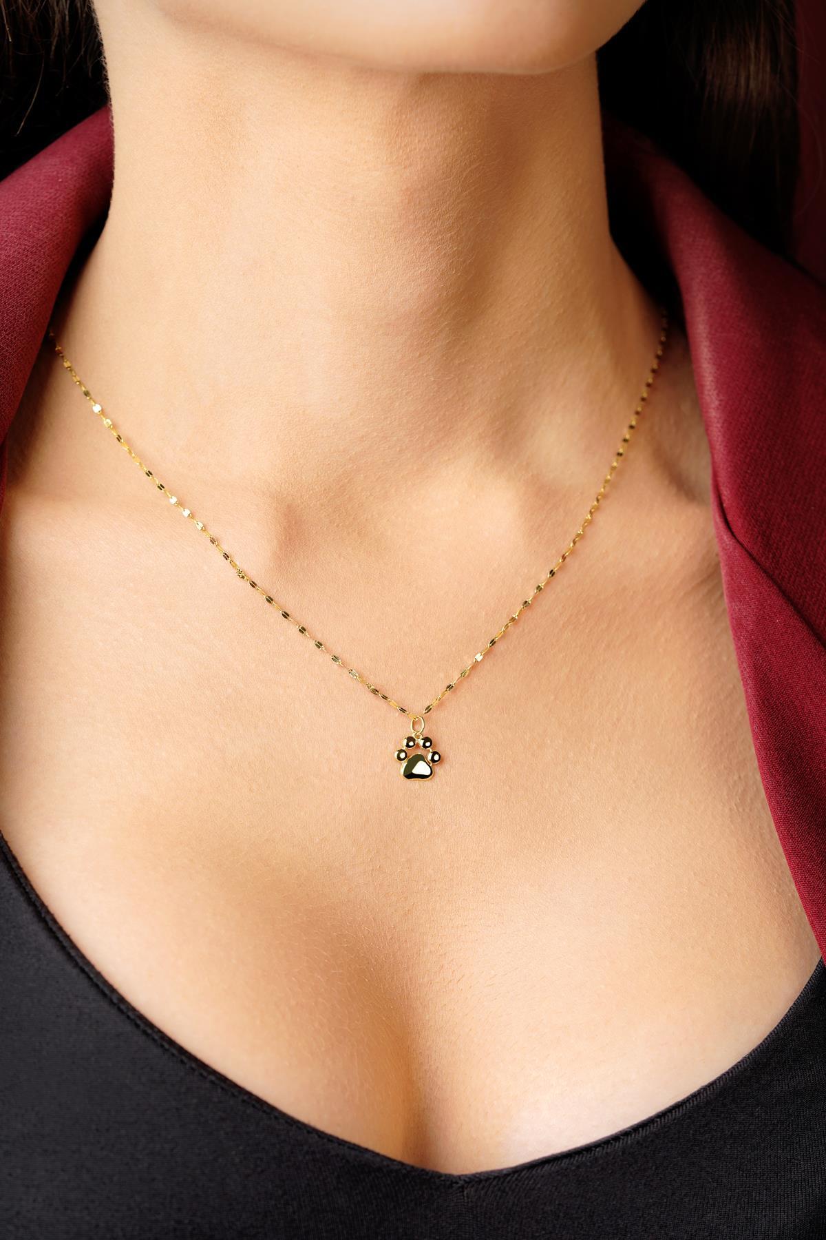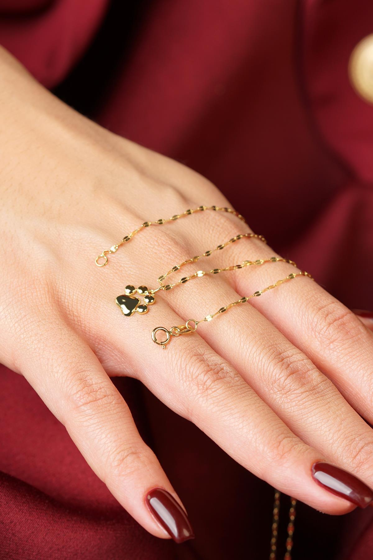14 Ayar Altın Kedi Köpek Pati Detaylı Aynalı Zincir Kolye