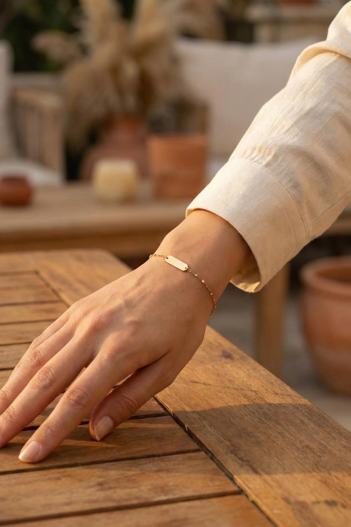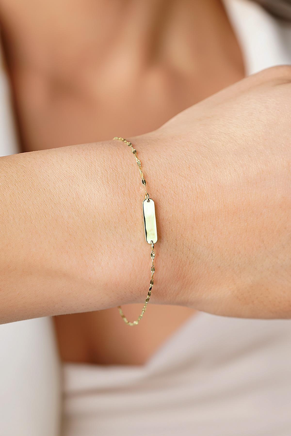 14 Ayar Altın Aynalı Zincirli Plaka Bileklik