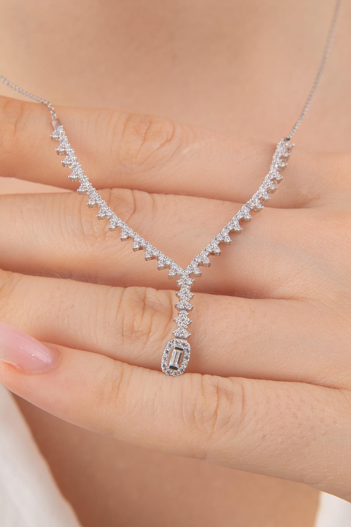 14 Ayar Altın Baget Taş Detaylı Zincirli Kolye