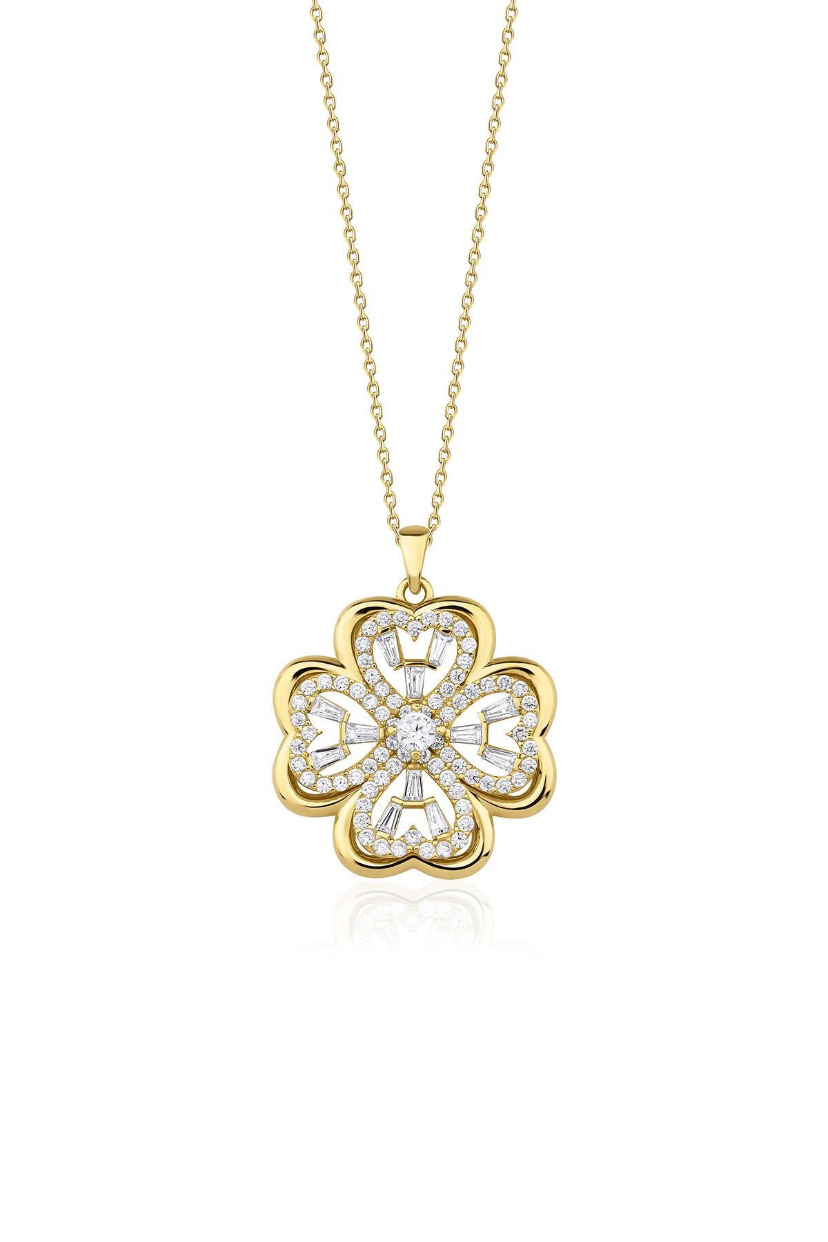 14 Ayar Altın Baget Taşlı Modern Yonca Kolye
