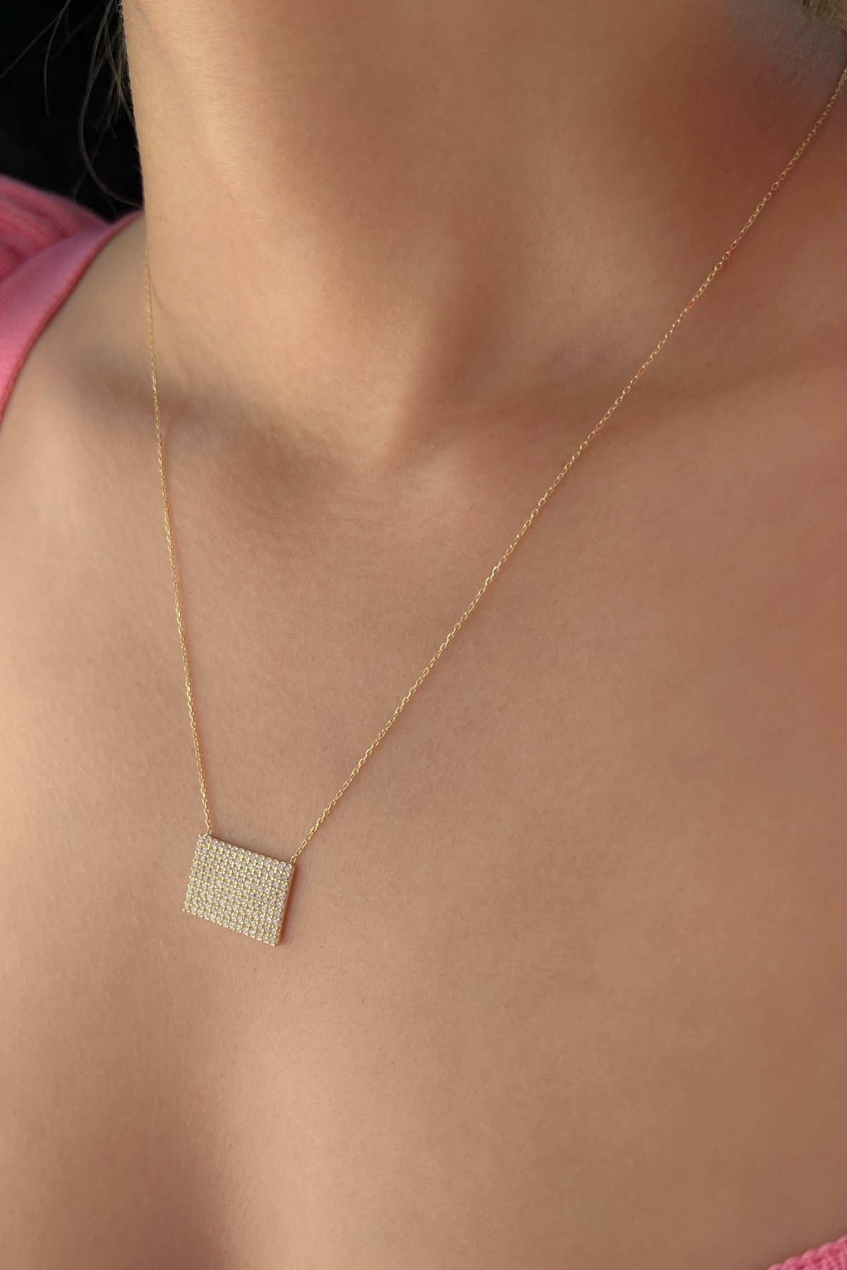 14 Ayar Altın Beyaz Taşlı Dikdörtgen Kolye