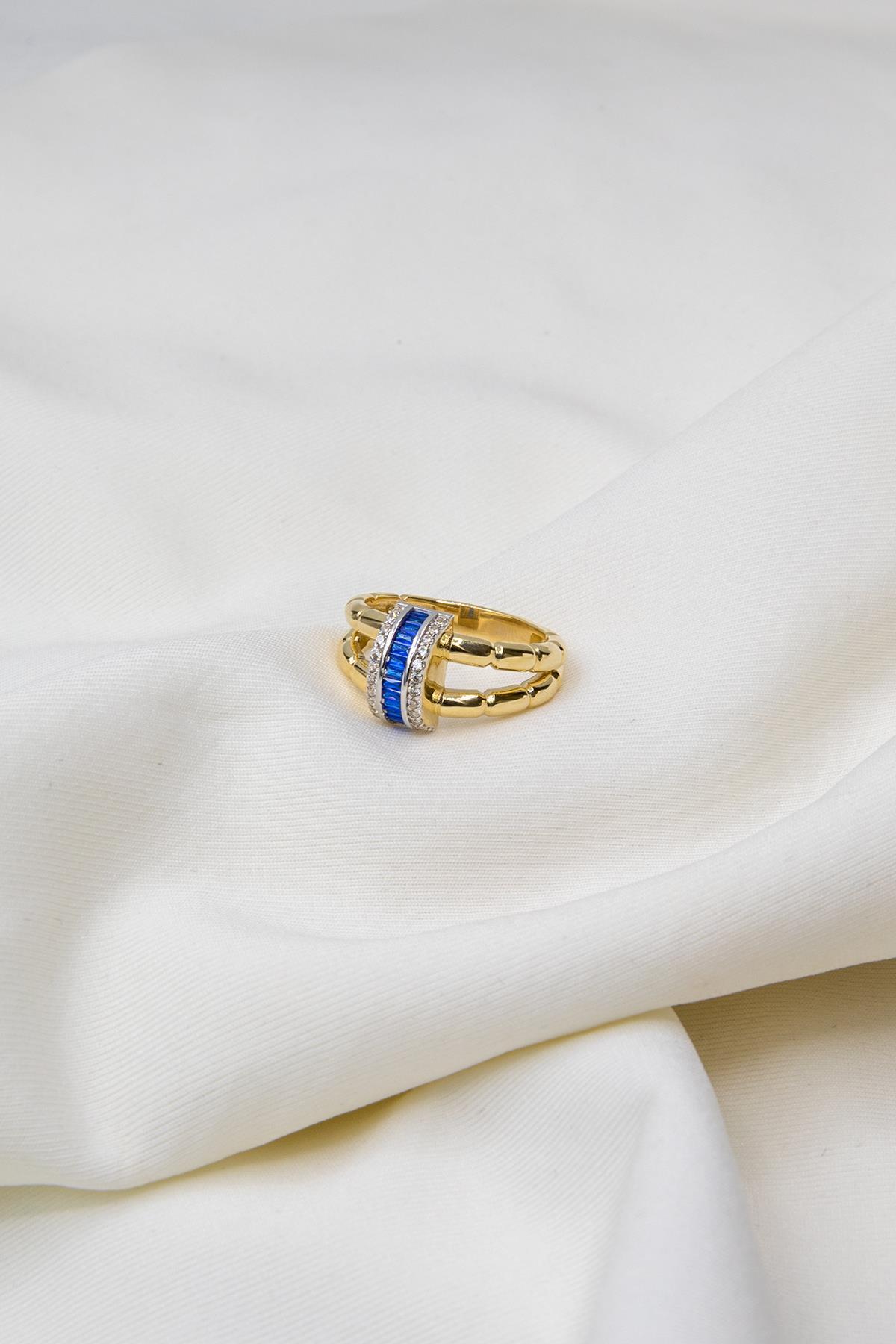 14 Ayar Altın Çift Boğumlu Mavi Şerit Baget Yüzük