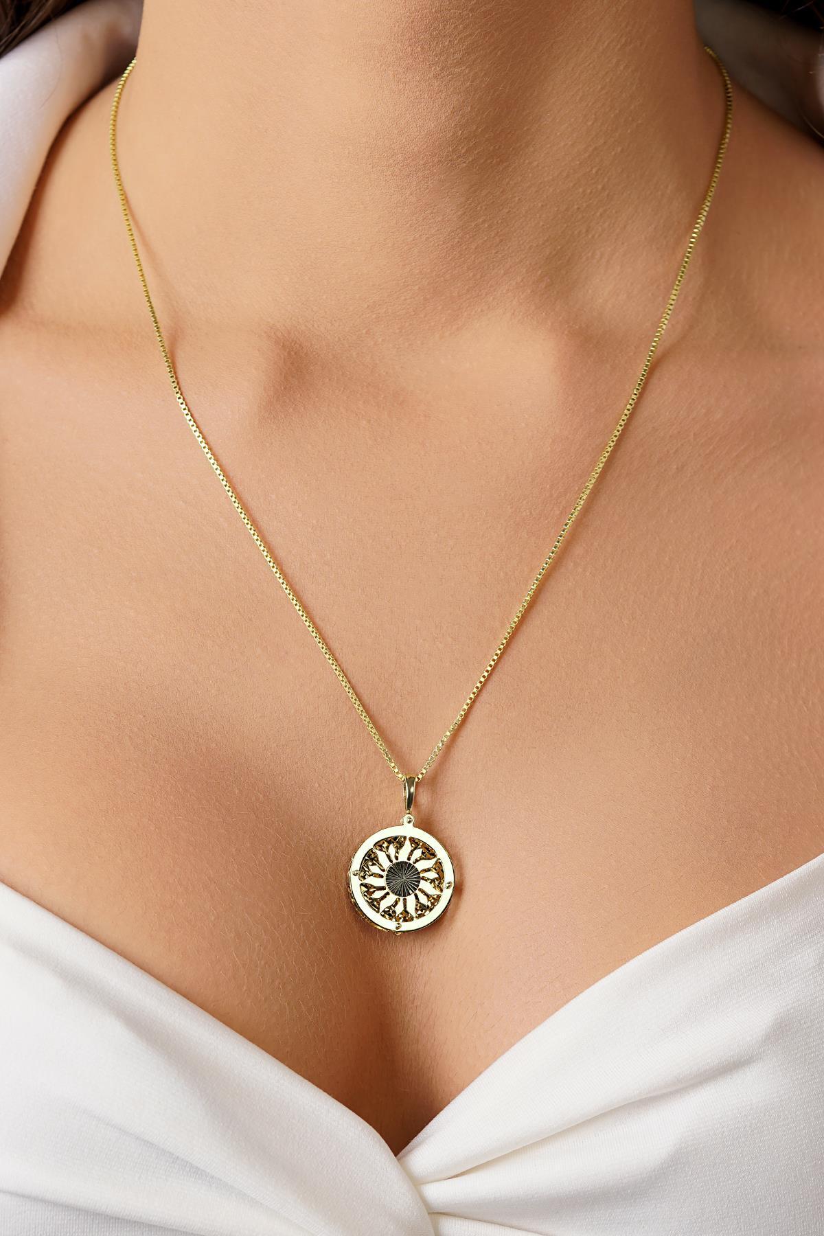14 Ayar Altın Desenli Küp Zincirli Güneş Uçlu Kolye