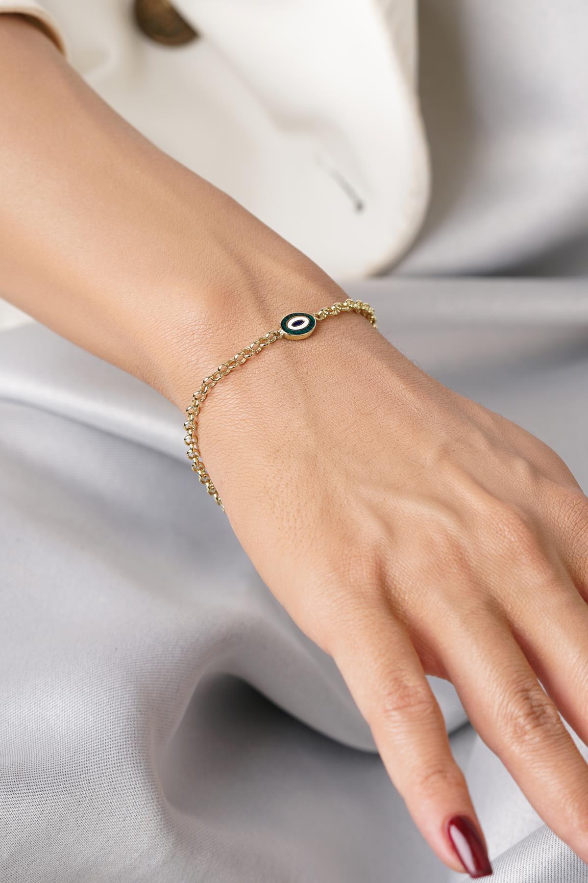 14 Ayar Altın Doch Zincirde Yeşil Mineli Nazarlık Bileklik