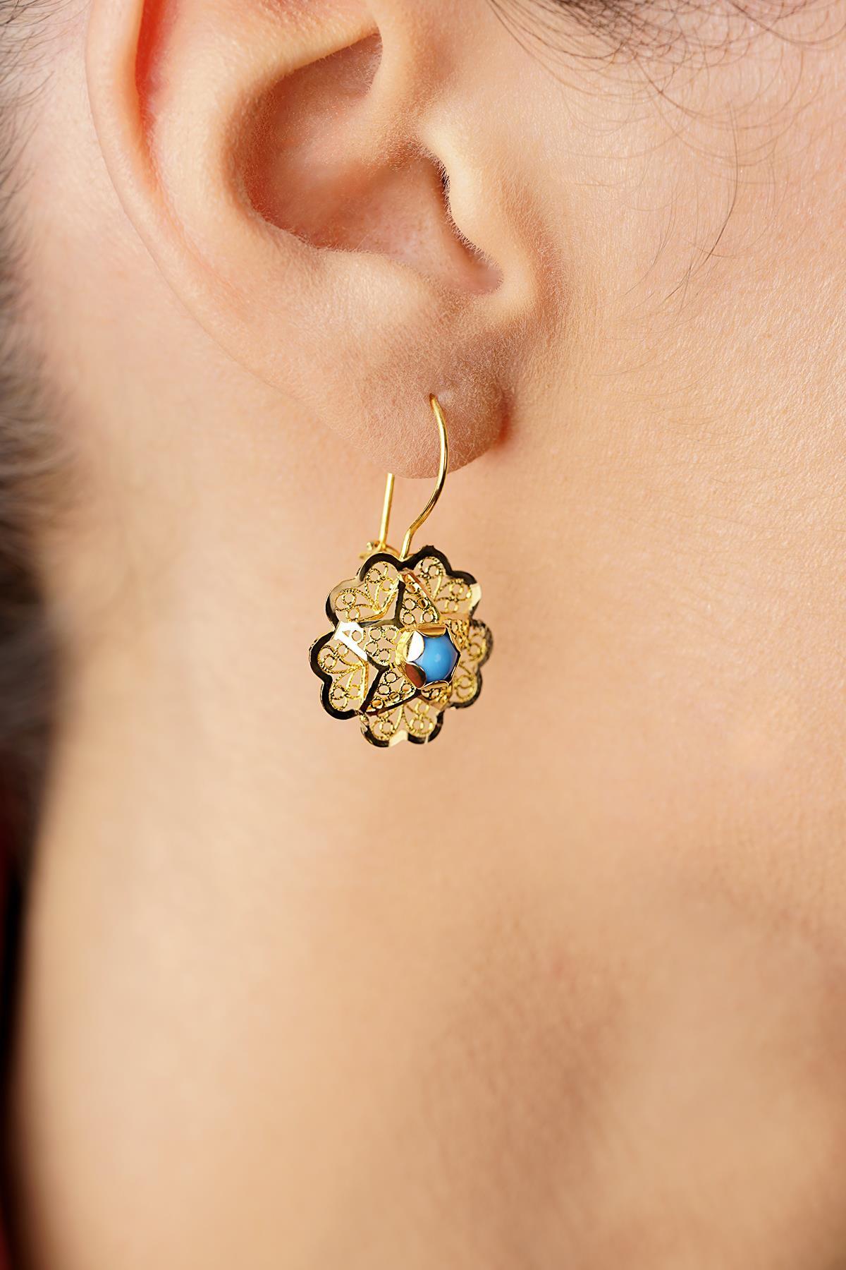 14 Ayar Altın Firuze Taşlı Gül Motifli Telkari Küpe - Anne Küpesi