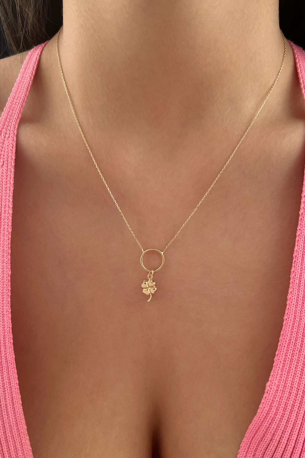 14 Ayar Altın Halka İçerisinde Yonca Sallantılı Kolye