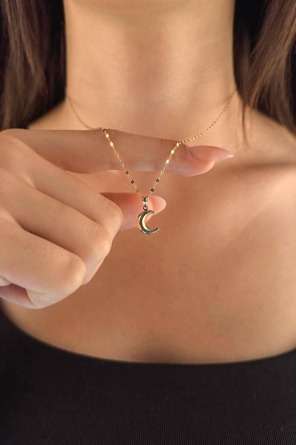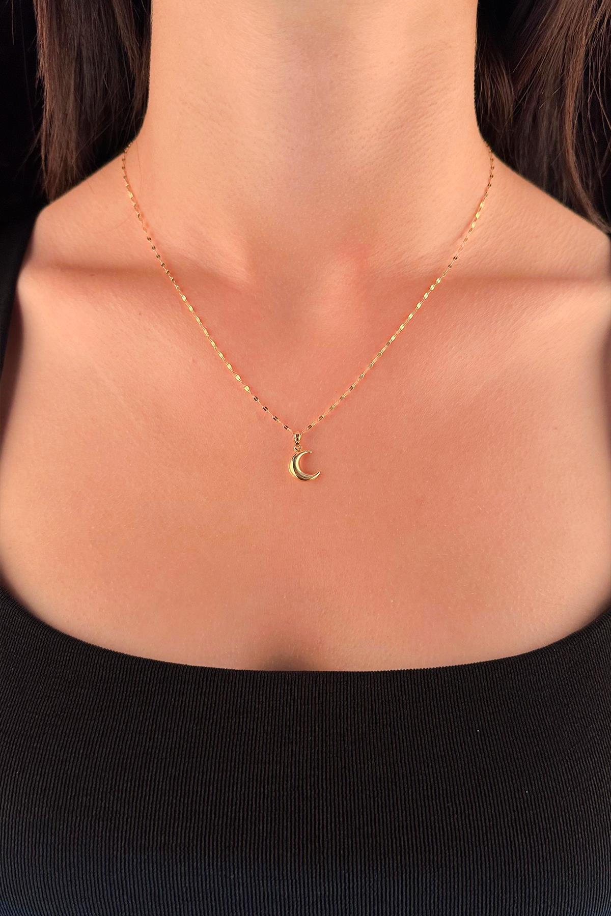 14 Ayar Altın Işıltılı Aynalı Zincir Hilal Ay Uçlu Kolye