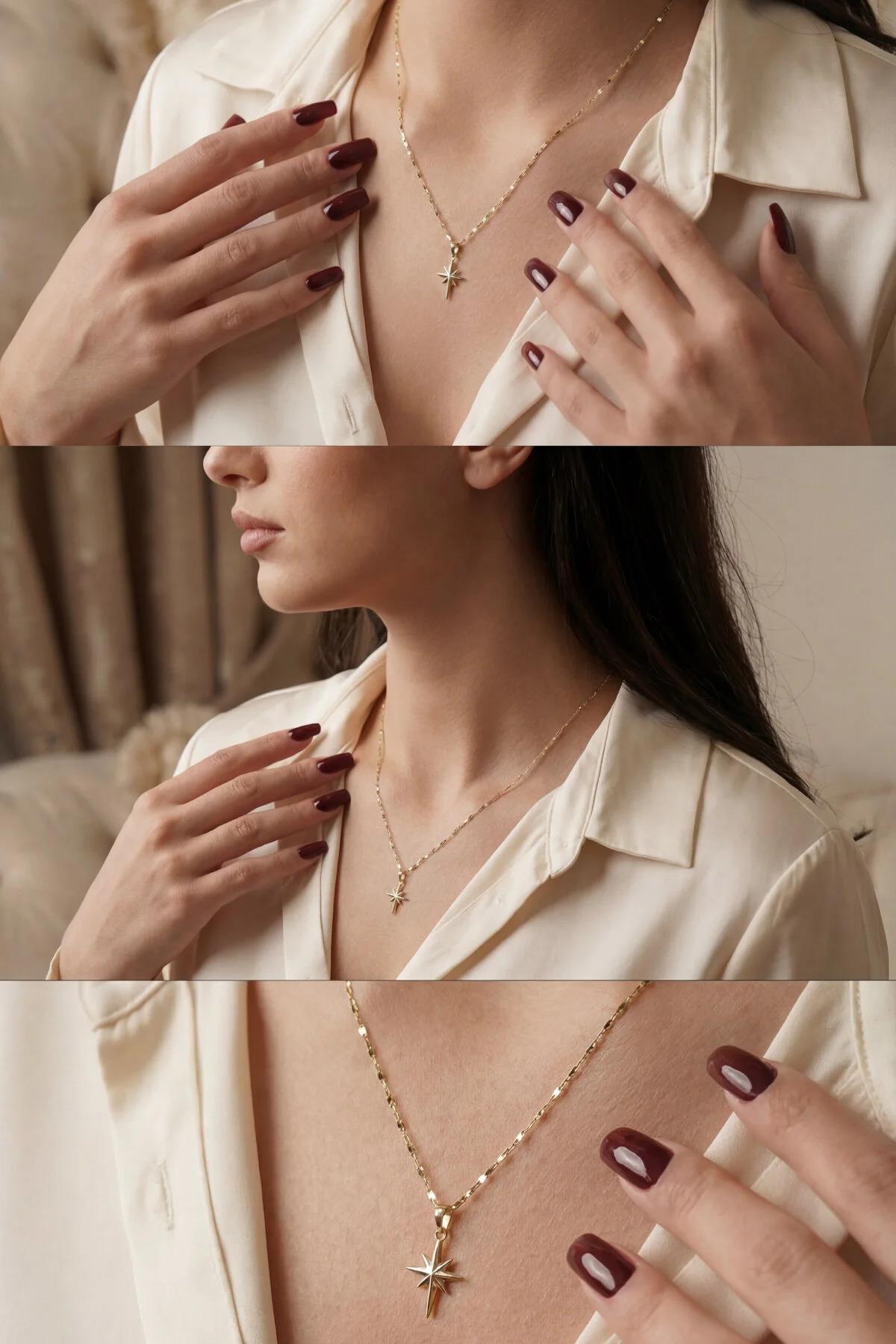 Bu kolye, tek başına takıldığında “temiz ve güçlü” bir çizgi verir. Aynalı zincirin ışık oyunları, kolyeyi sade kıyafetlerde bile öne taşır. Eğer katmanlı görünüm seviyorsanız, daha kısa bir zincirle birlikte kullanıp Kuzey Yıldızı ucunu odak noktası yapabilirsiniz.