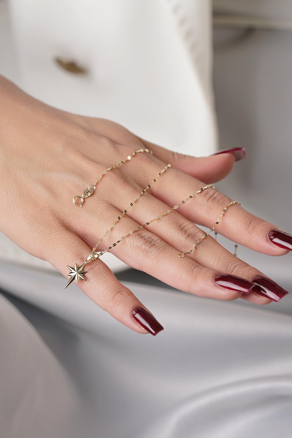Kuzey Yıldızı motifi, yüzyıllardır yön bulmanın ve kararlı duruşun simgesi olarak anlatılır. Bu kolye ise o anlamı, fazla söze ihtiyaç duymadan; boyunda zarif bir imza gibi taşır. Görseldeki formuyla öne çıkan detay, ince ve ışığı “ayna” gibi yakalayan zincir dokusunun, minimal Kuzey Yıldızı ucu ile dengeli bir şekilde buluşmasıdır. Taş kullanılmadan, tamamı 14 ayar altınla tasarlanan bu model; sade ama dikkat çekici bir görünüm arayanlar için güçlü bir tercihtir.