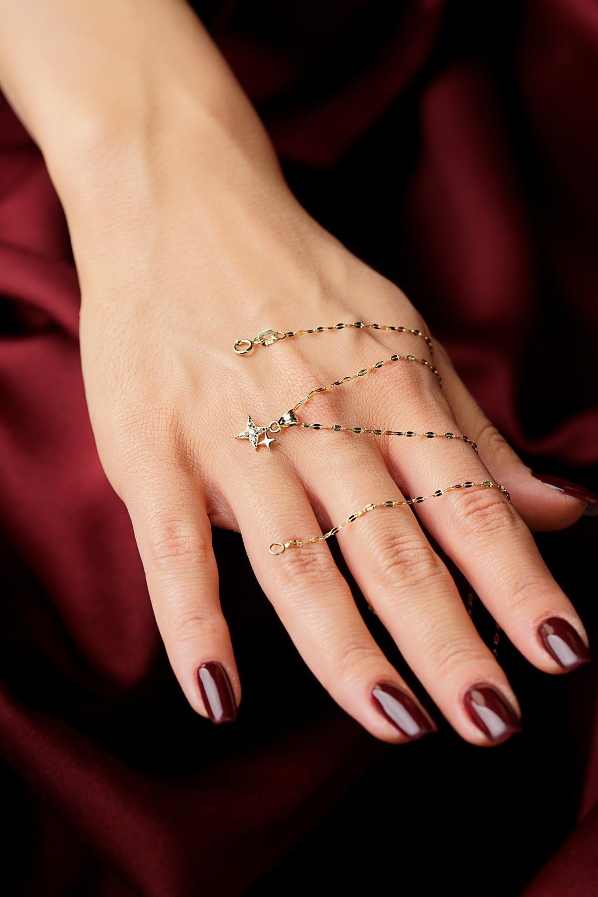 14 Ayar Altın Işıltılı Minik İkili Taşlı Yıldız Aynalı Zincirli Kolye