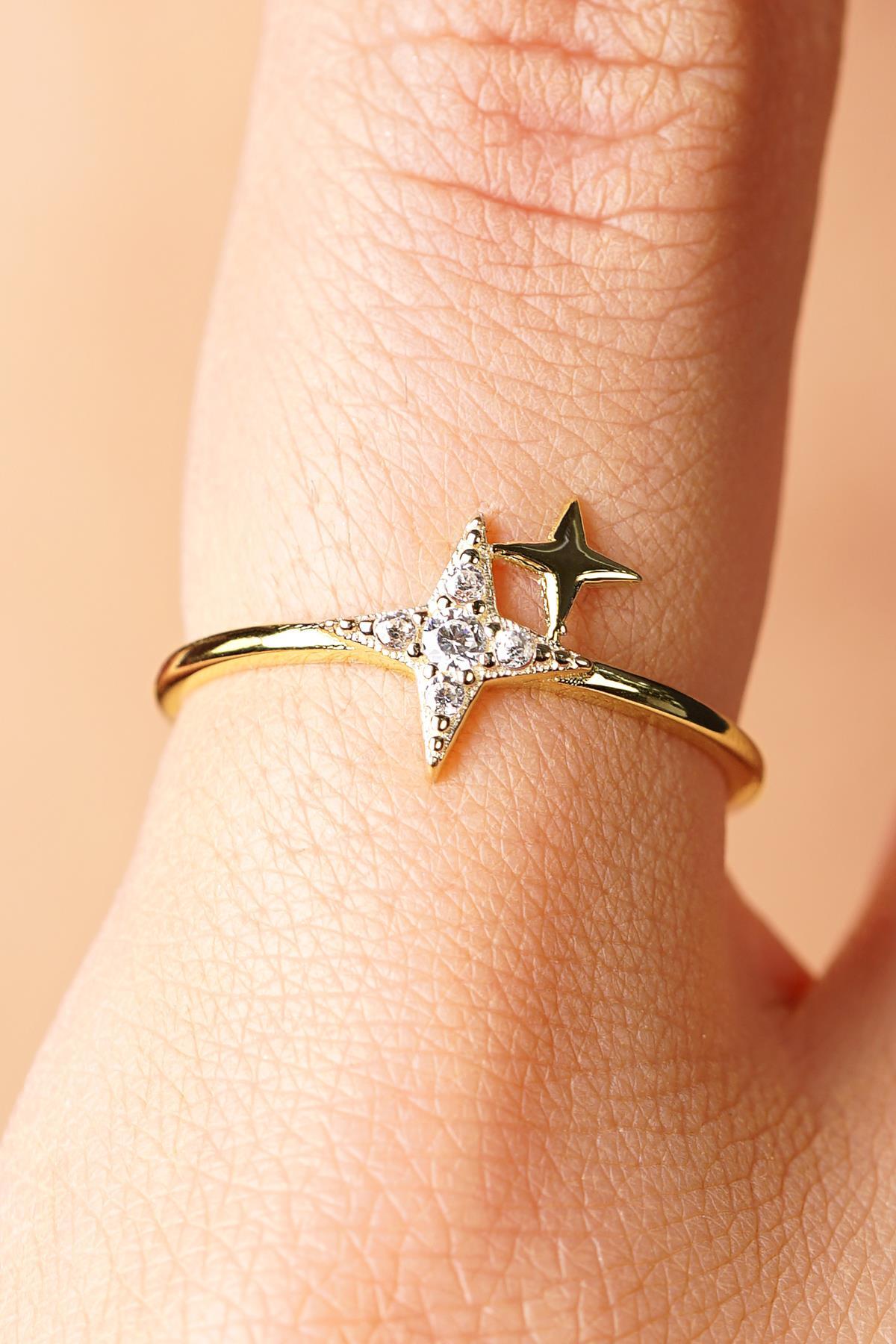 14 Ayar Altın Işıltılı Minik İkili Taşlı Yıldız Yüzük