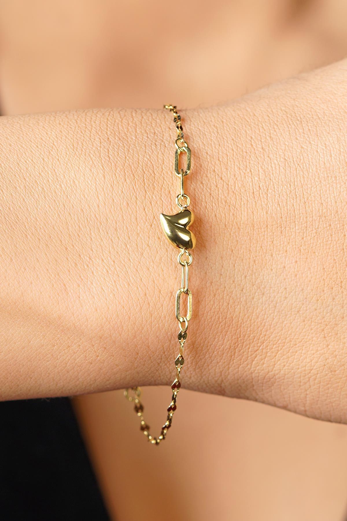 14 Ayar Altın Kalp Detaylı Aynalı Zincir Bileklik
