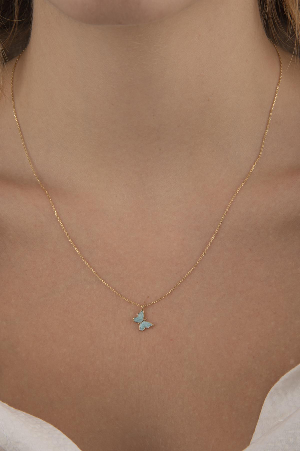 14 Ayar Altın Mavi Mineli Kelebek Kolye