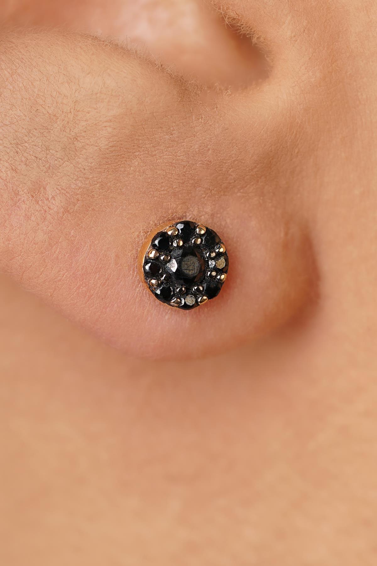 14 Ayar Altın Papatya Desenli Siyah Taşlı Küpe