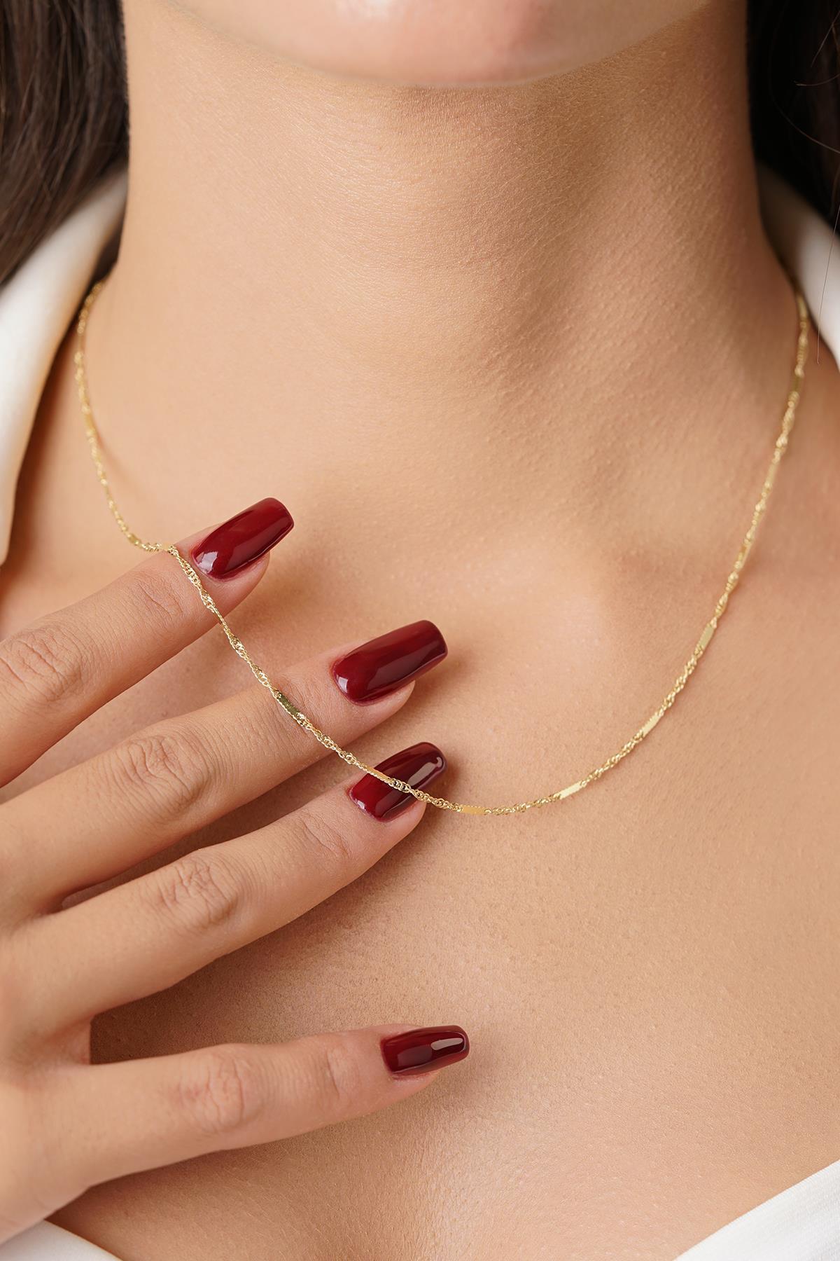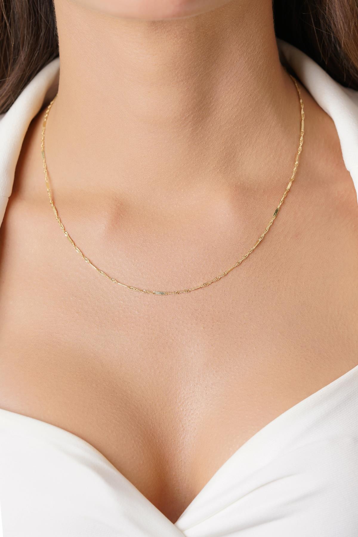 14 Ayar Altın Plaka Detaylı Singapur Zincir Kolye