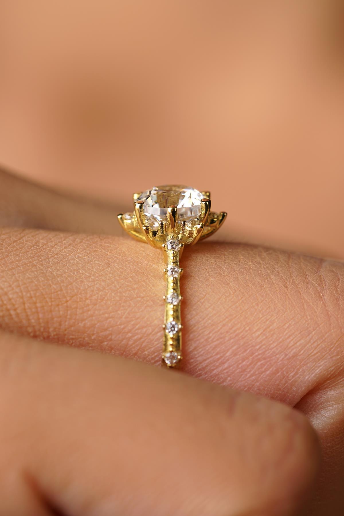 14 Ayar Altın Beyaz Lotus Tektaş Yüzük