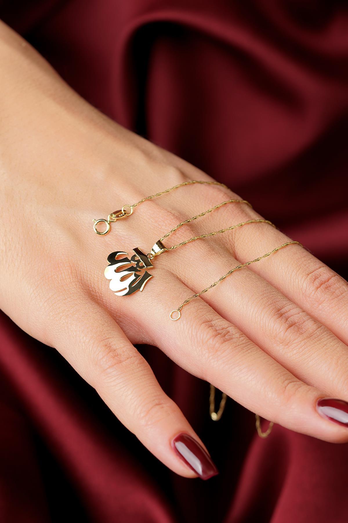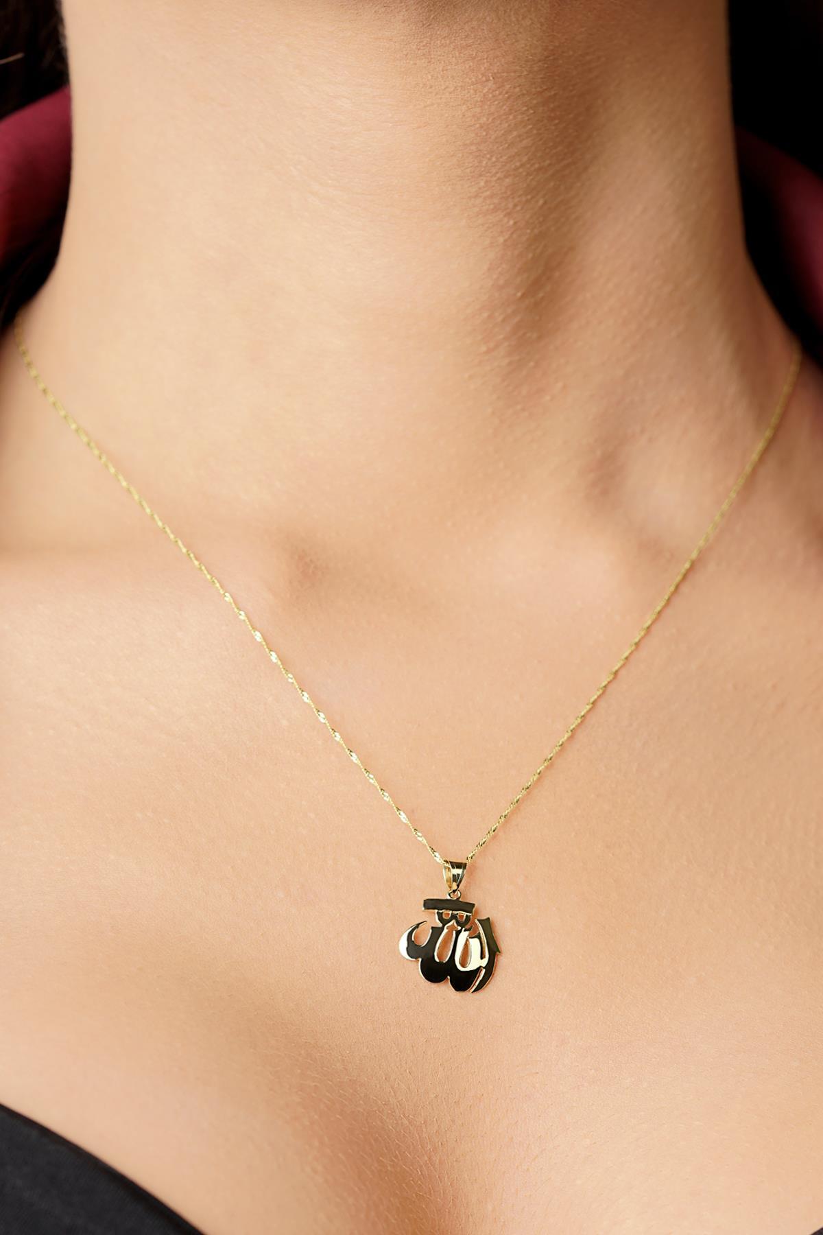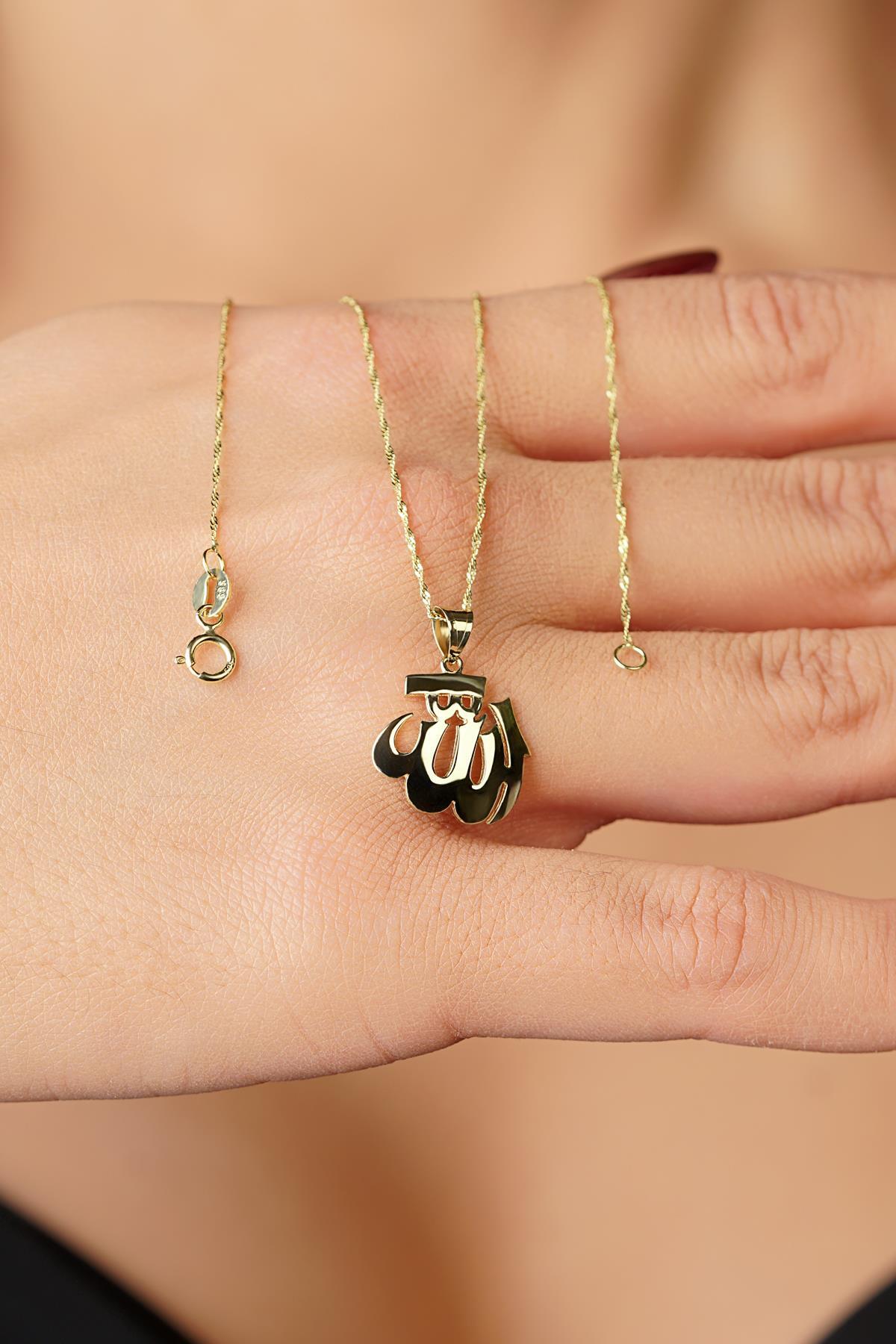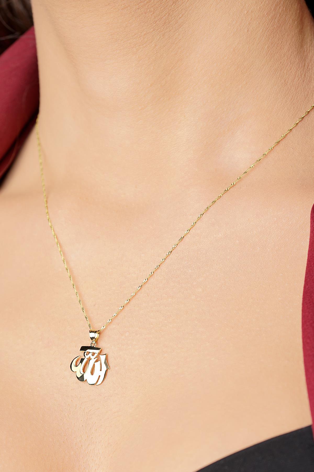 14 Ayar Altın Singapur Zincir Allah Yazılı Kolye Büyük