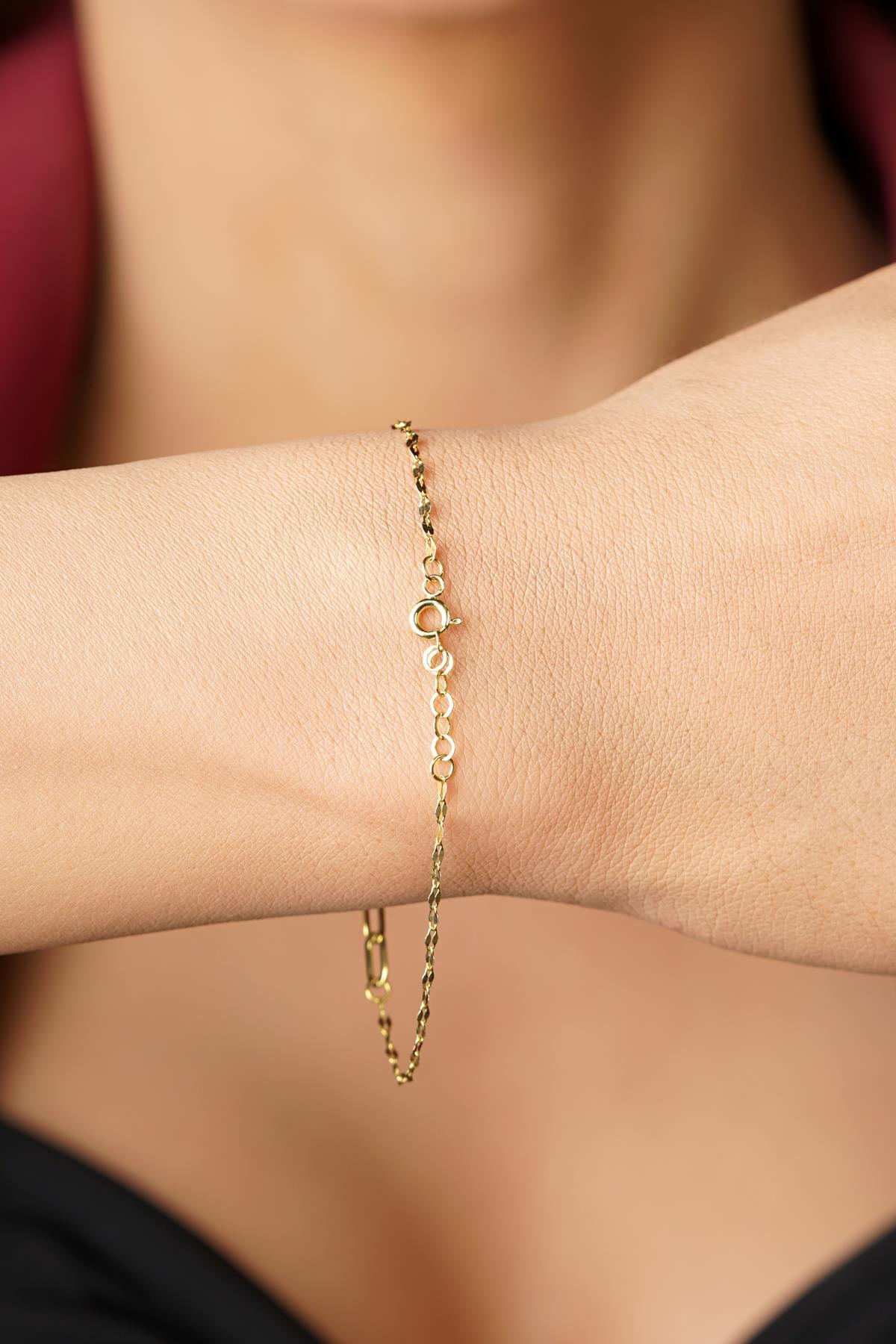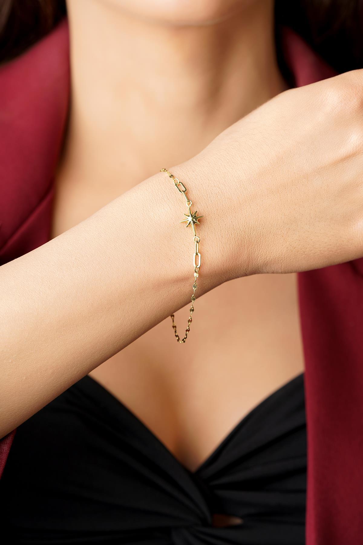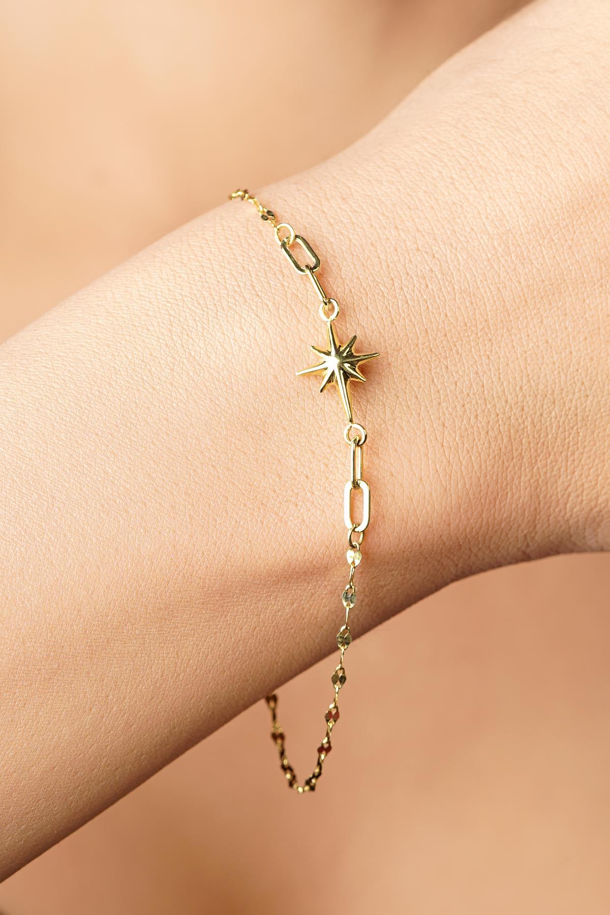 14 Ayar Altın Şişko Kuzey Yıldız Aynalı Zincirl Bileklik