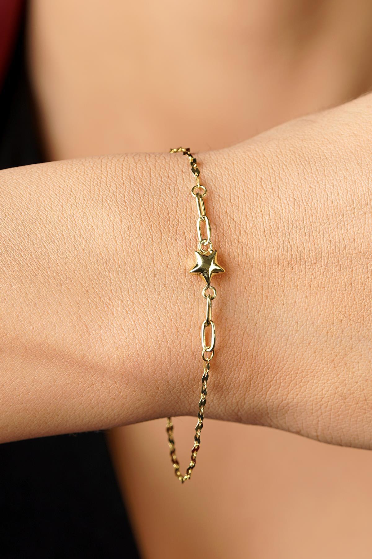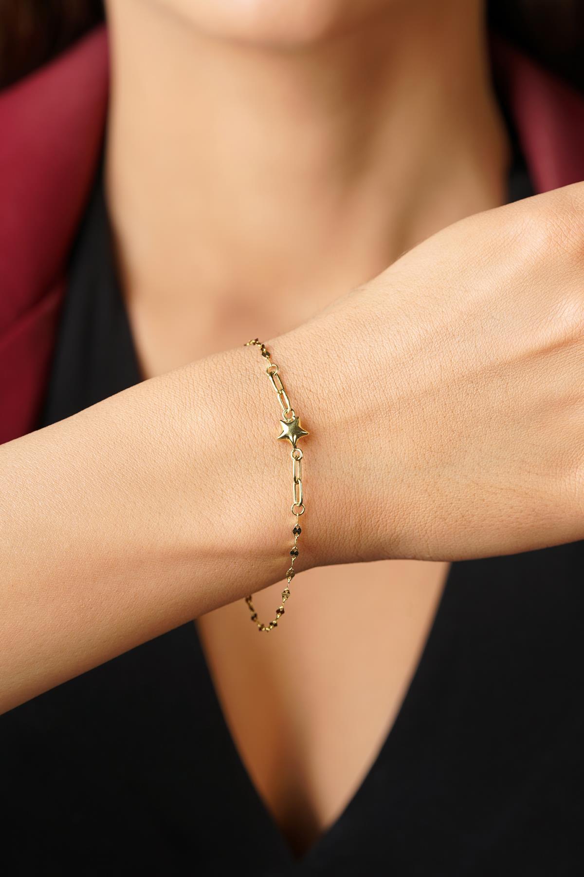14 Ayar Altın Şişko Yıldız Detaylı Aynalı Zincir Bileklik