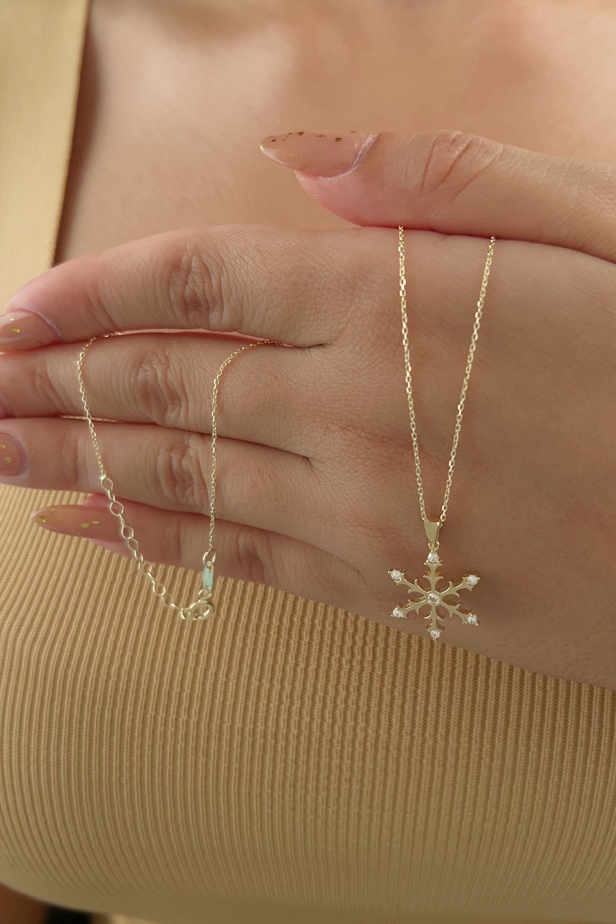 14 Ayar Altın Taş Detaylı Kar Tanesi Kolye