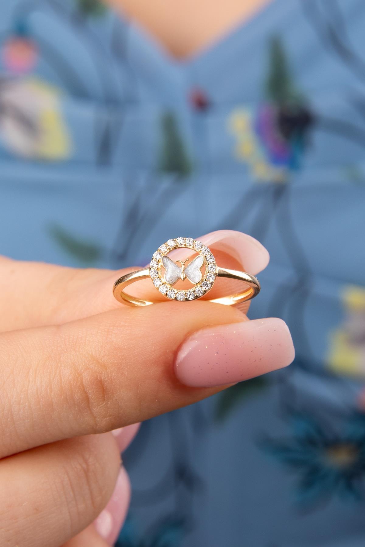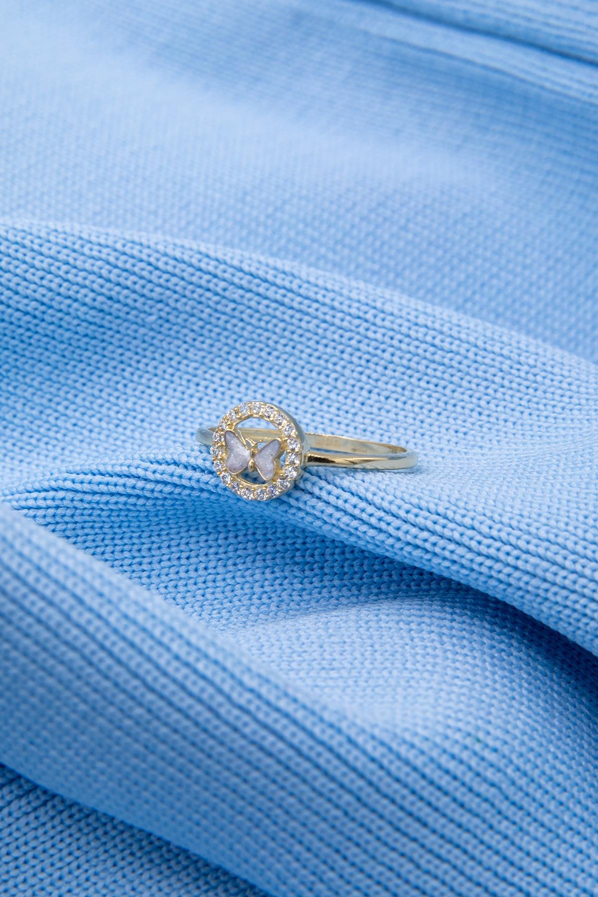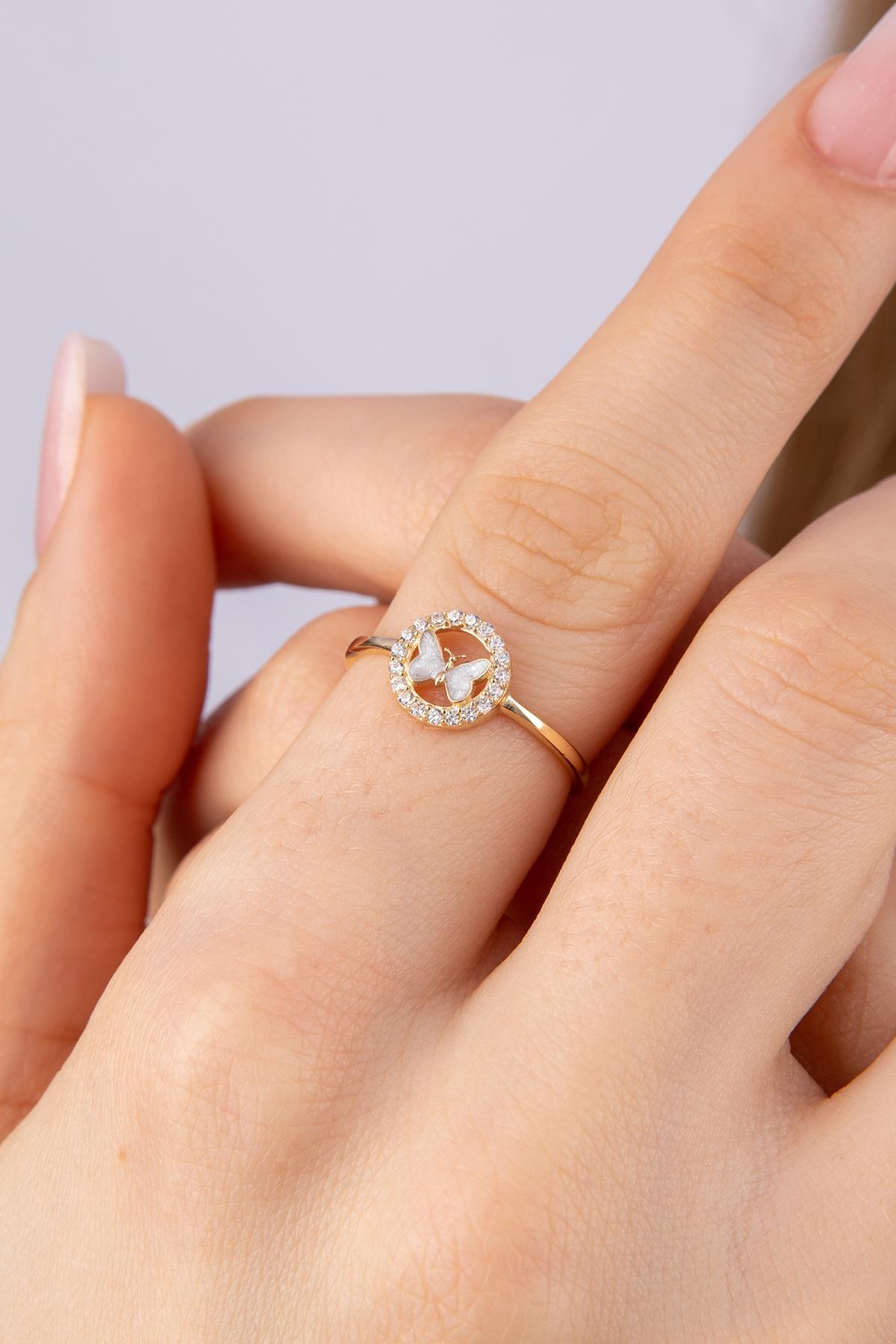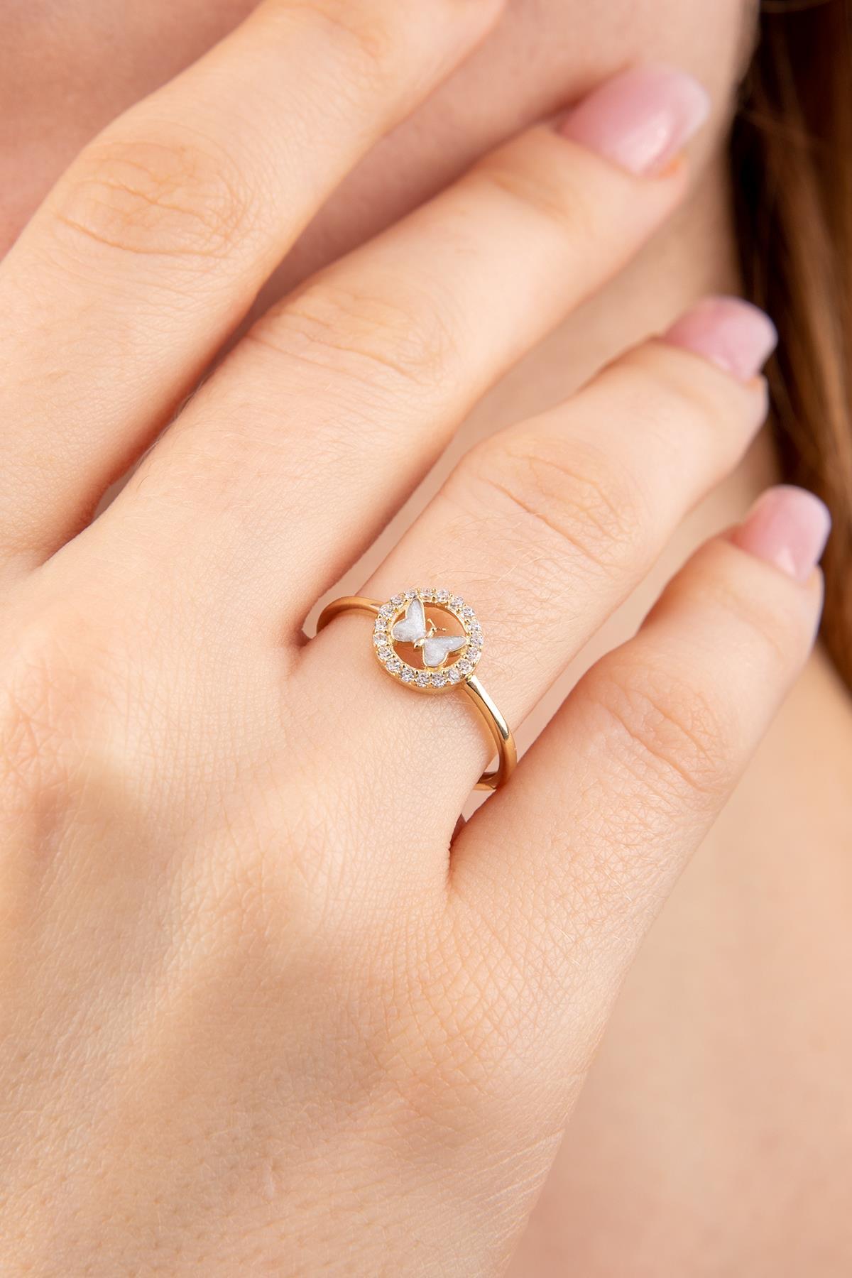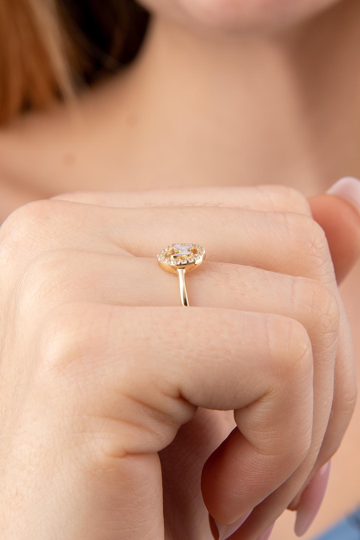 14 Ayar Altın Taşlı Beyaz Mineli Kelebek Yüzük