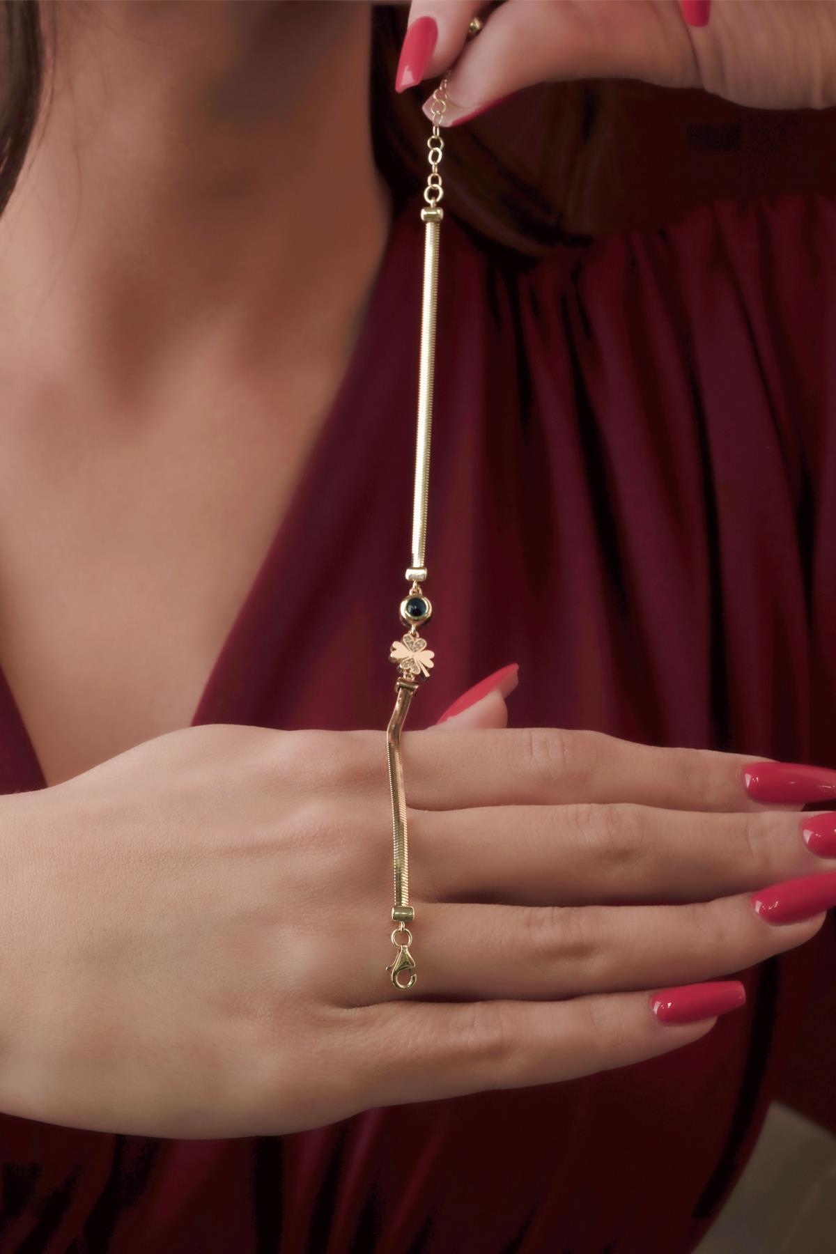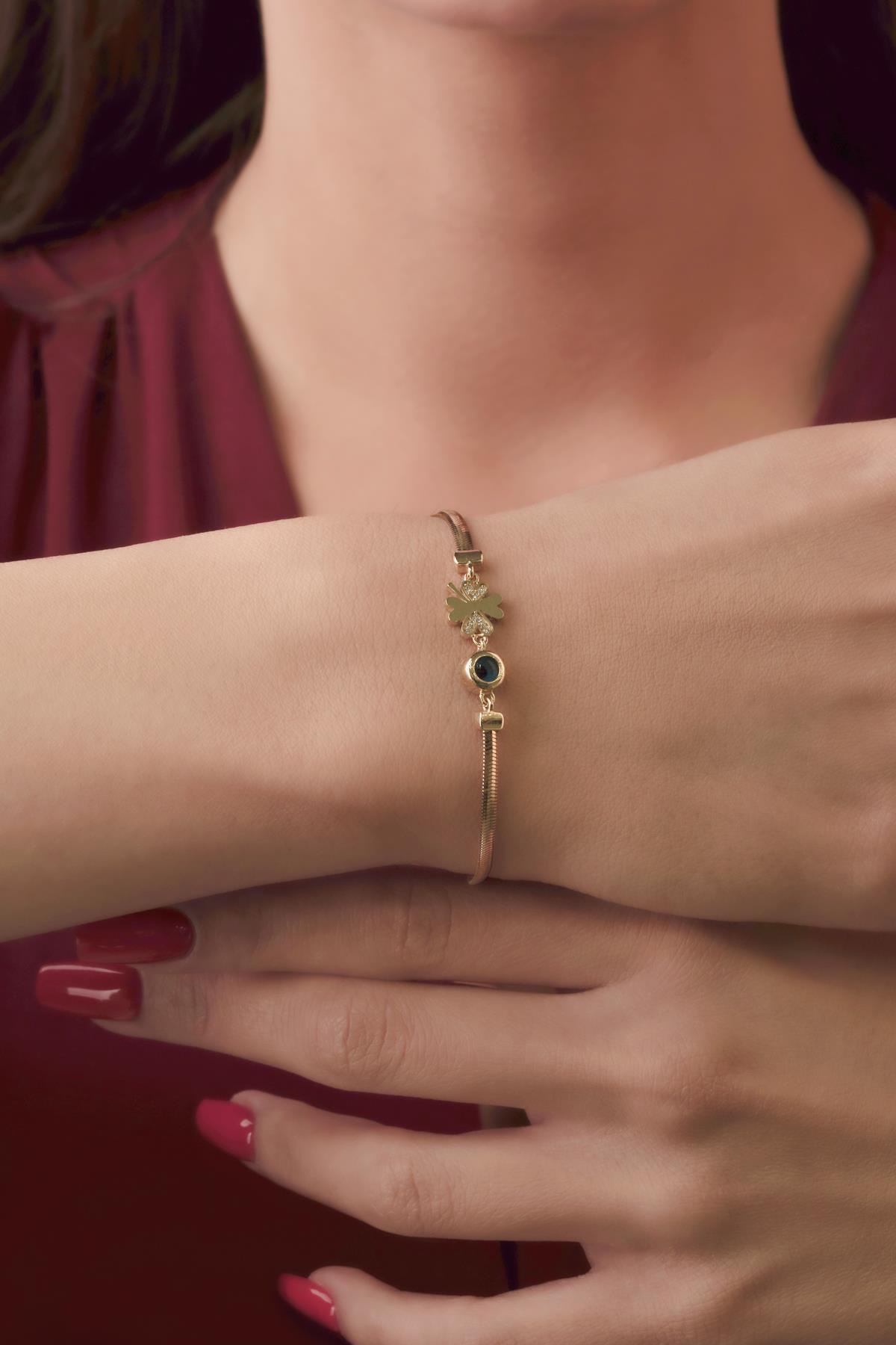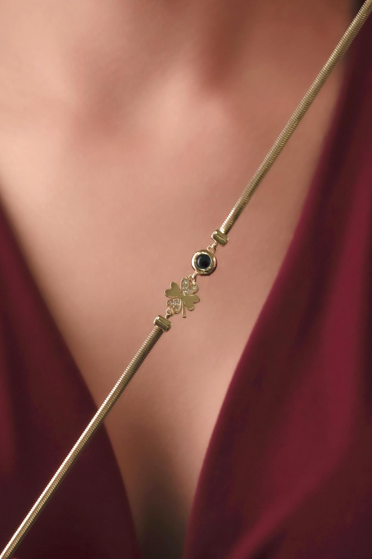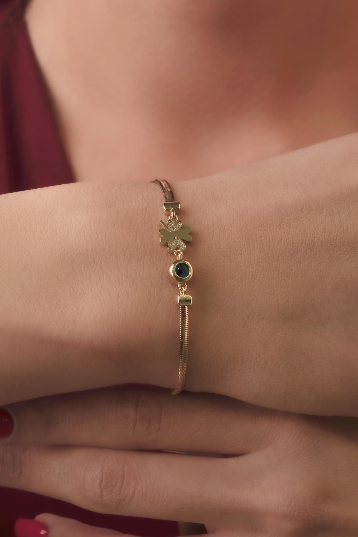 14 Ayar Altın Taşlı Şans Yoncası ve Göz Detaylı İtalyan Balıksırtı Bileklik