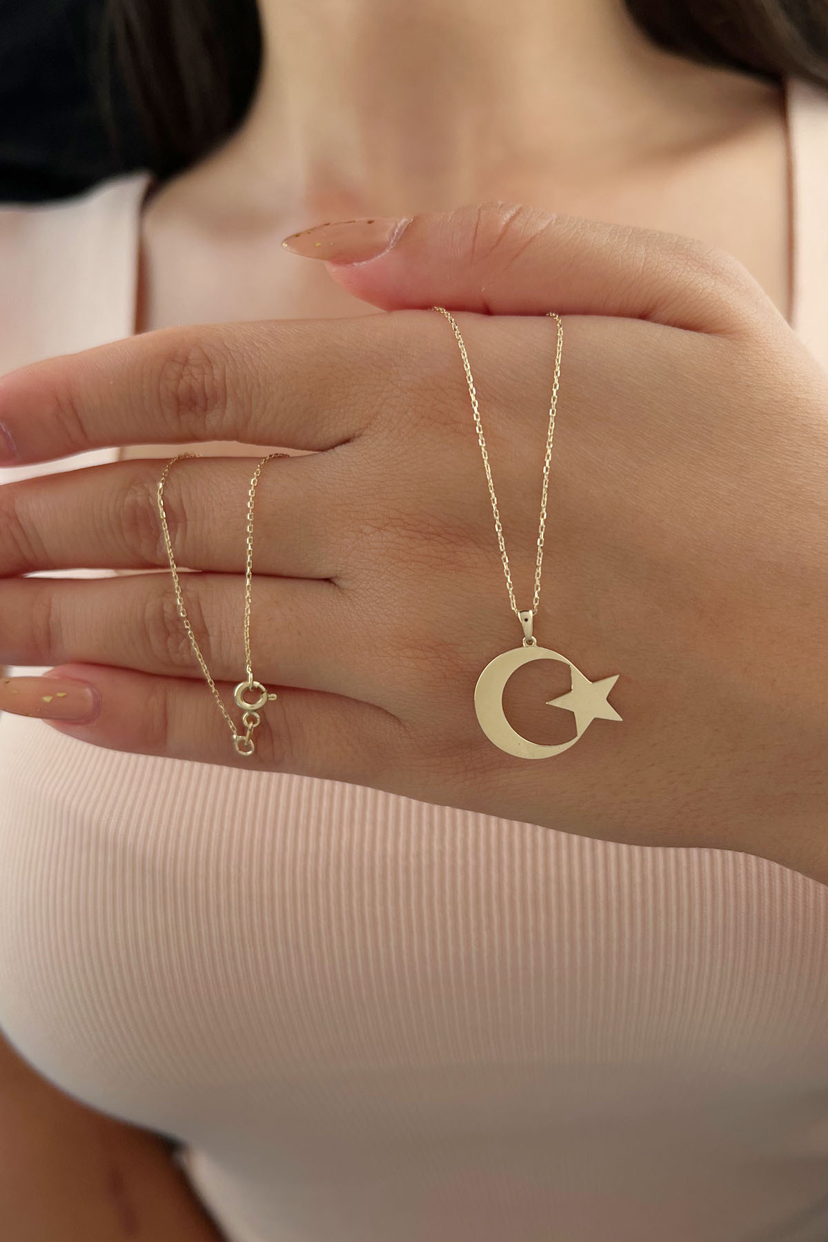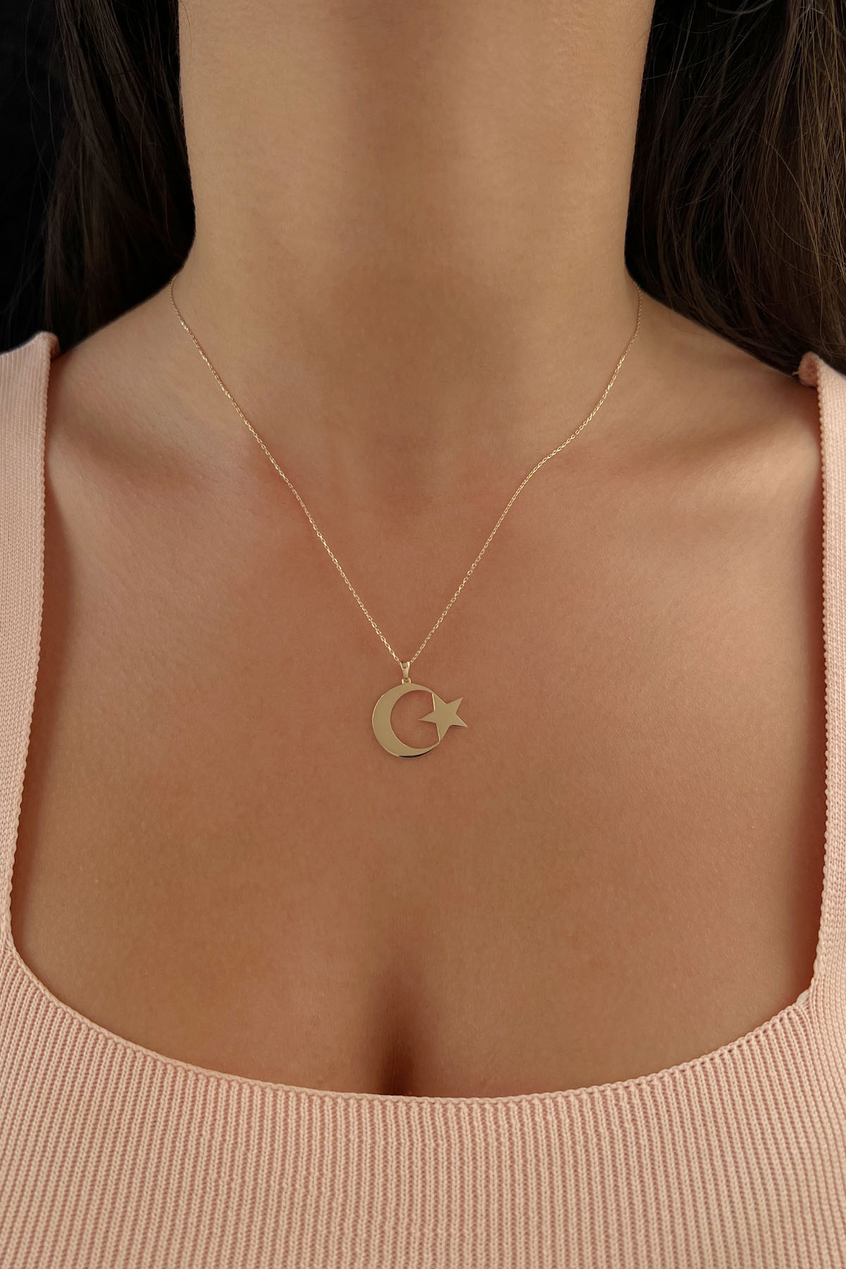 14 Ayar Altın Taşsız Ay Yıldız Kolye
