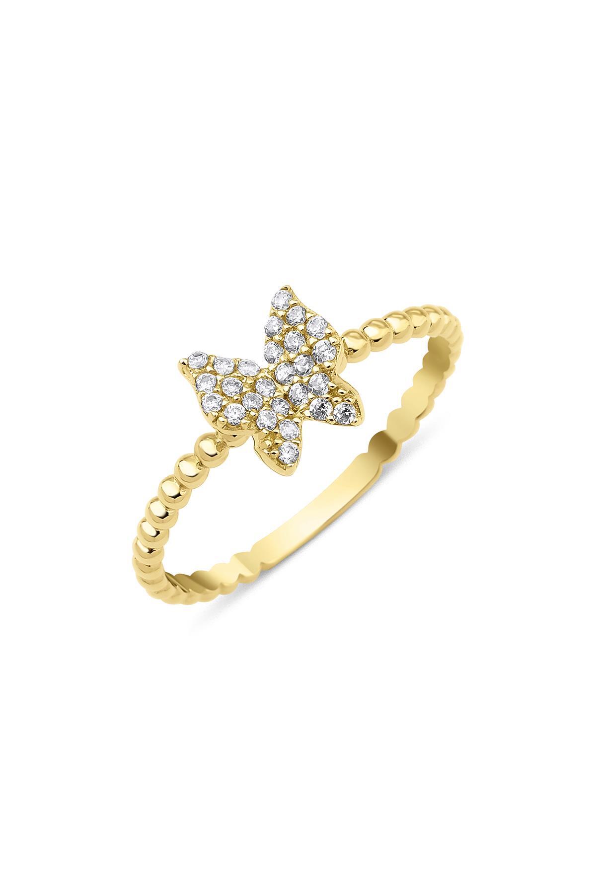 14 Ayar Altın Topcuk Detaylı Taşlı Kelebek Yüzük