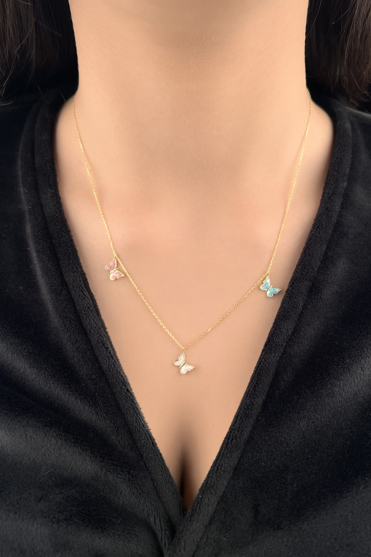 14 Ayar Altın Üç Renkli Kelebek Kolye