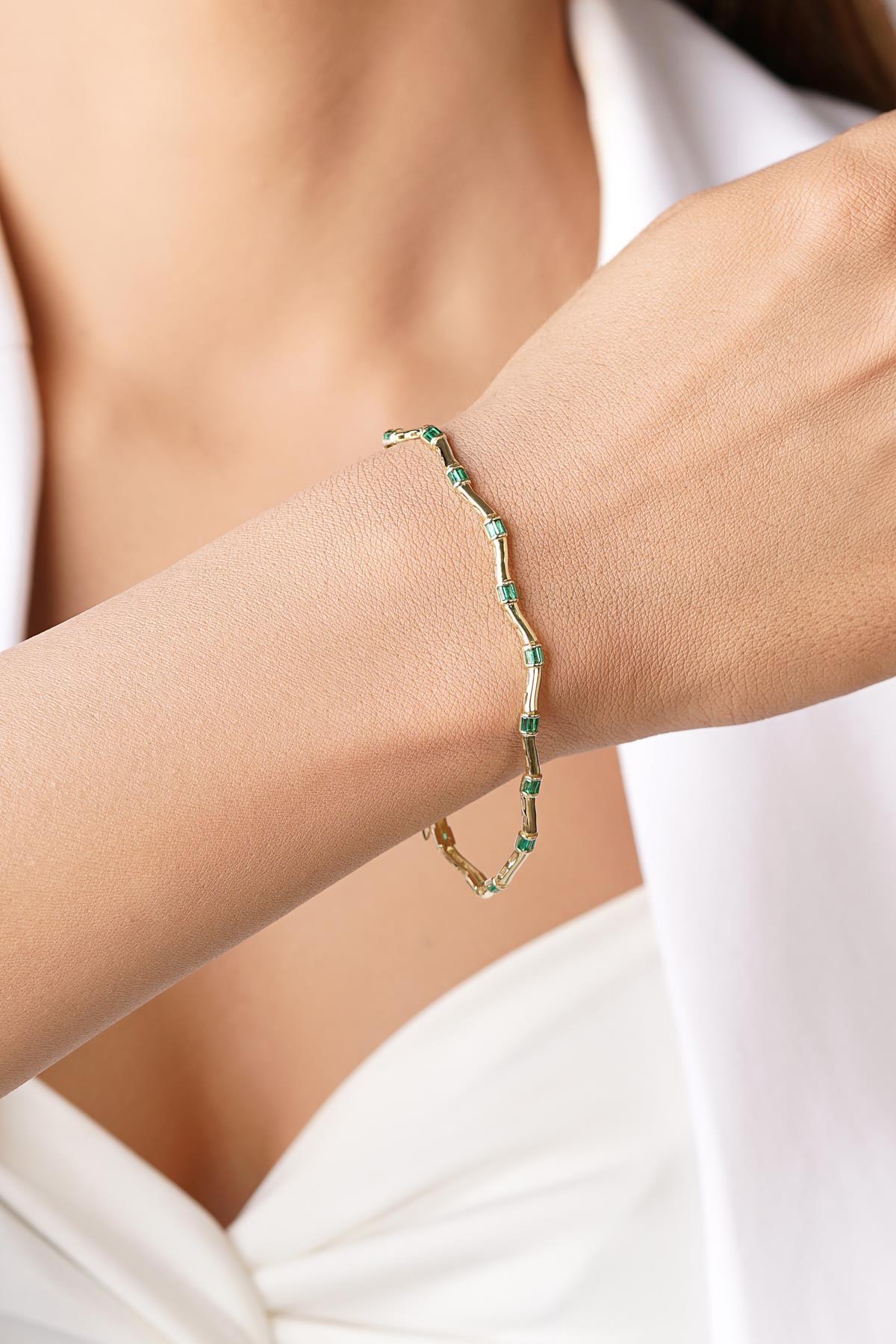 14 Ayar Altın Zümrüt Taşlı Modern Zikzak Bileklik