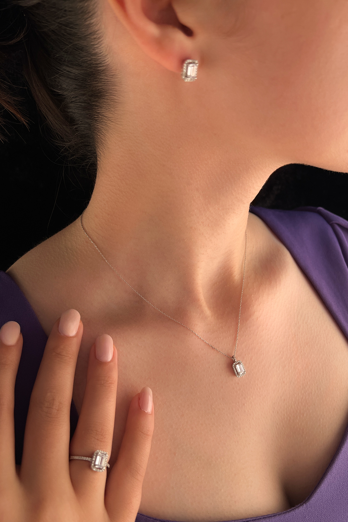 14 Ayar Altın Taşlı Baget Set (Kolye,Küpe,Yüzük)