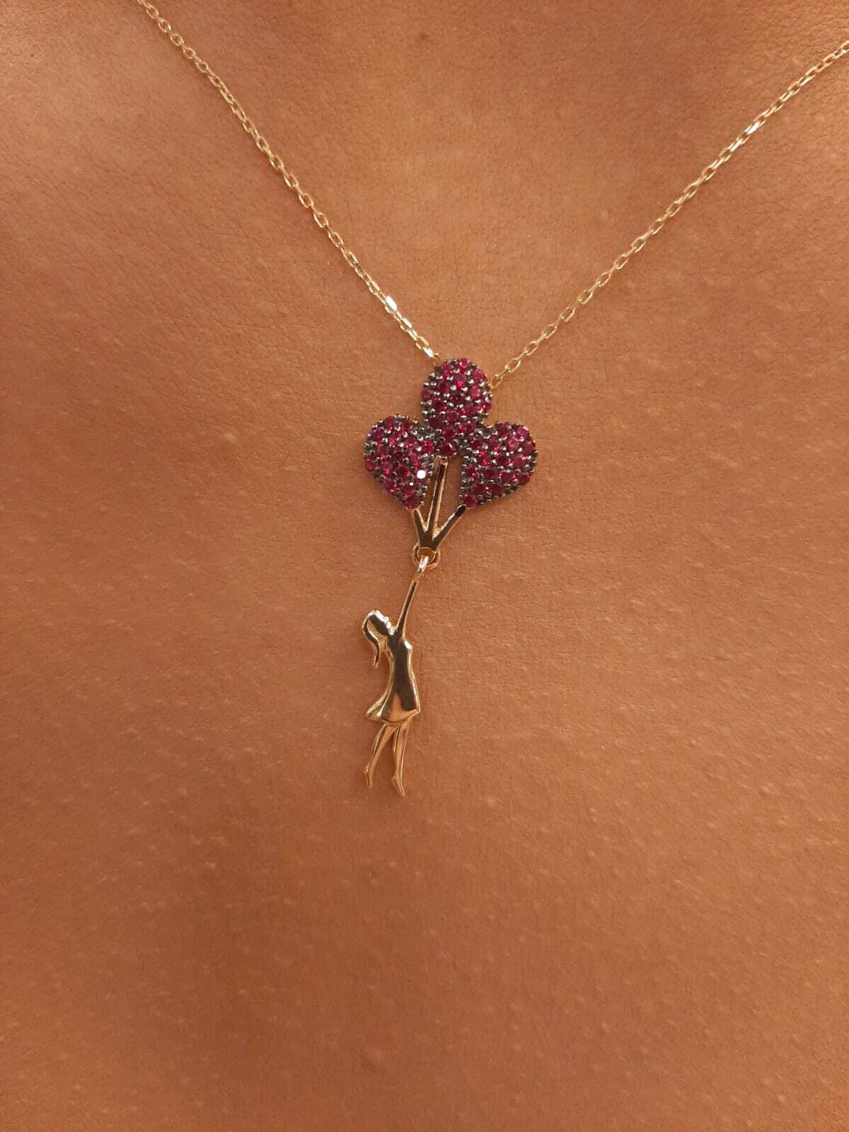 14 Ayar Altın Balonlu Kız Kırmızı Renk Kolye