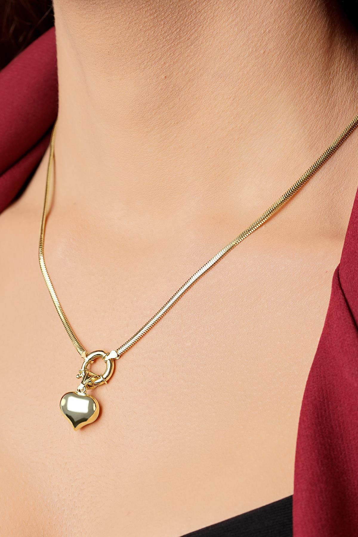 14 Ayar Altın Kalp Detaylı İtalyan Balık Sırtı Kolye