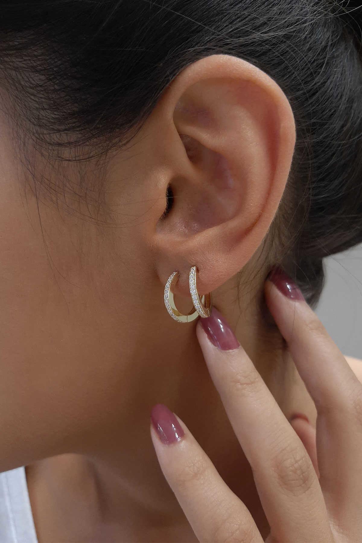 14 Ayar Altın Çift Sıra Taşlı Halka Küpe 3